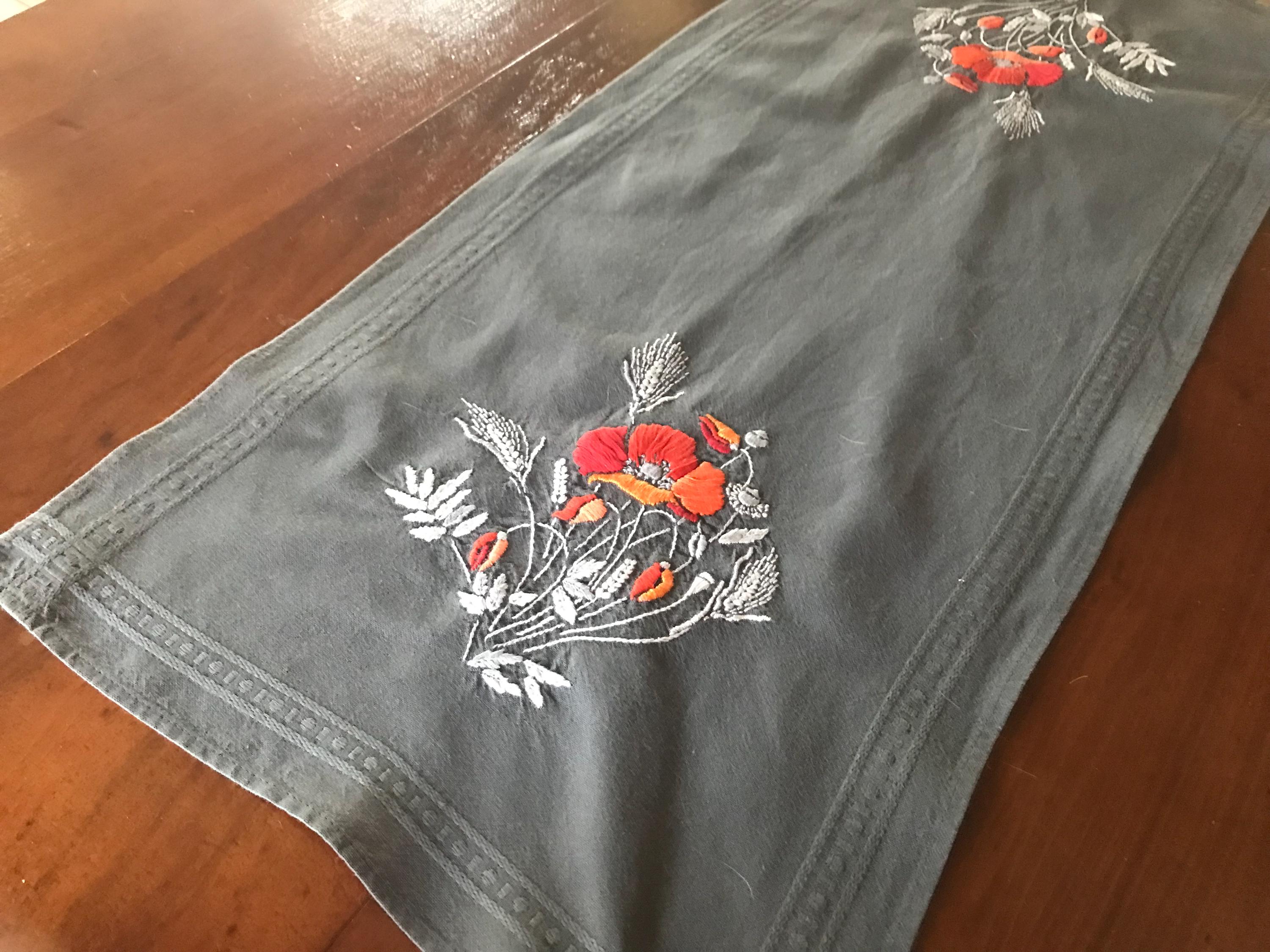 Hand embroidered table runner on gray cotton background, 40x100, floral pattern