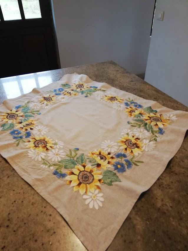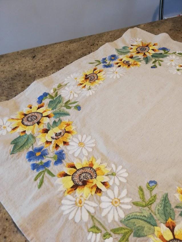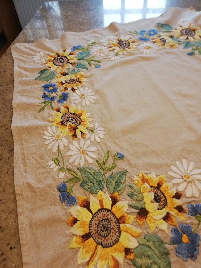 Hand embroidered tablecloth on 50% cotton 50% beige linen background, floral pattern