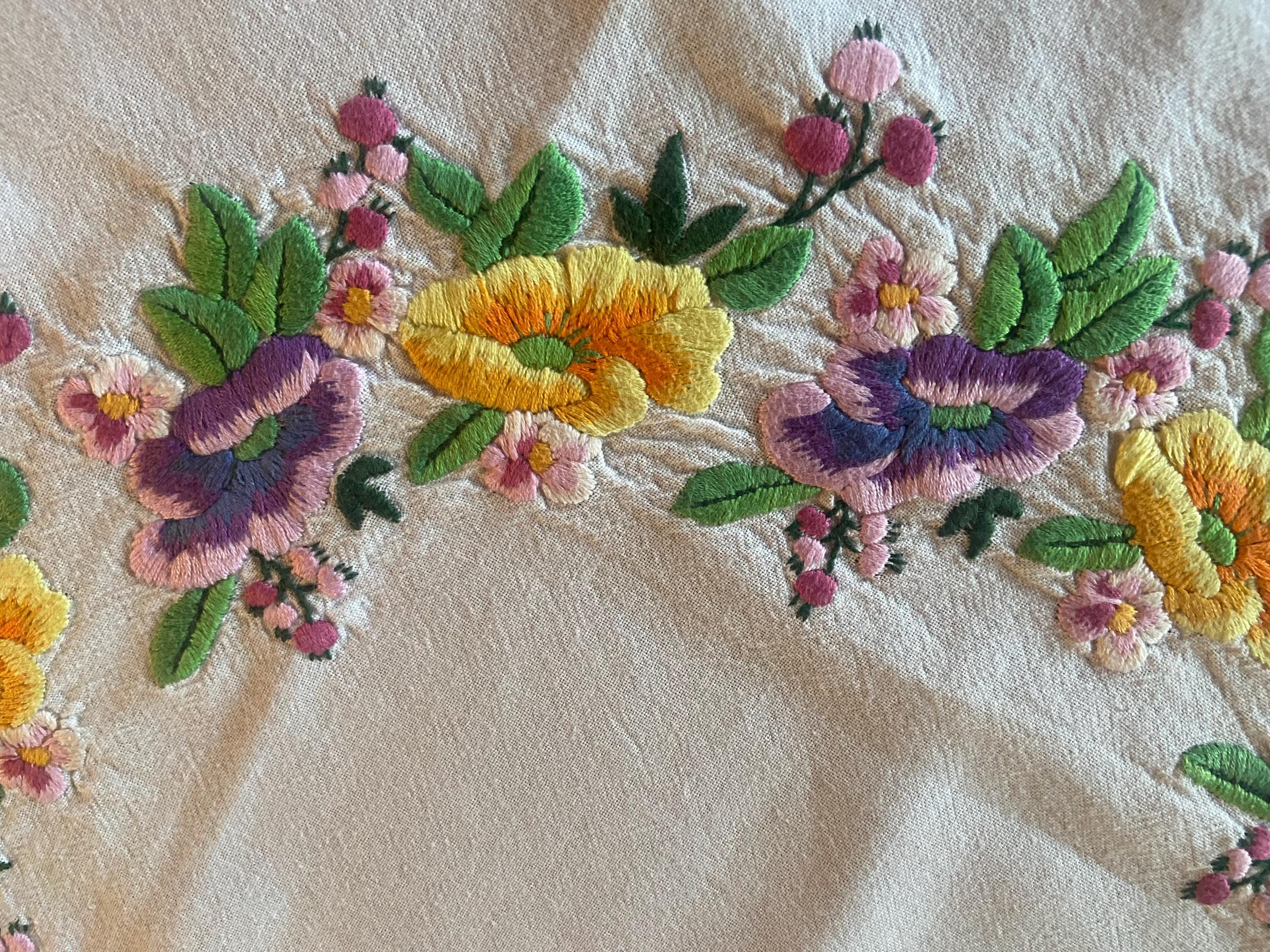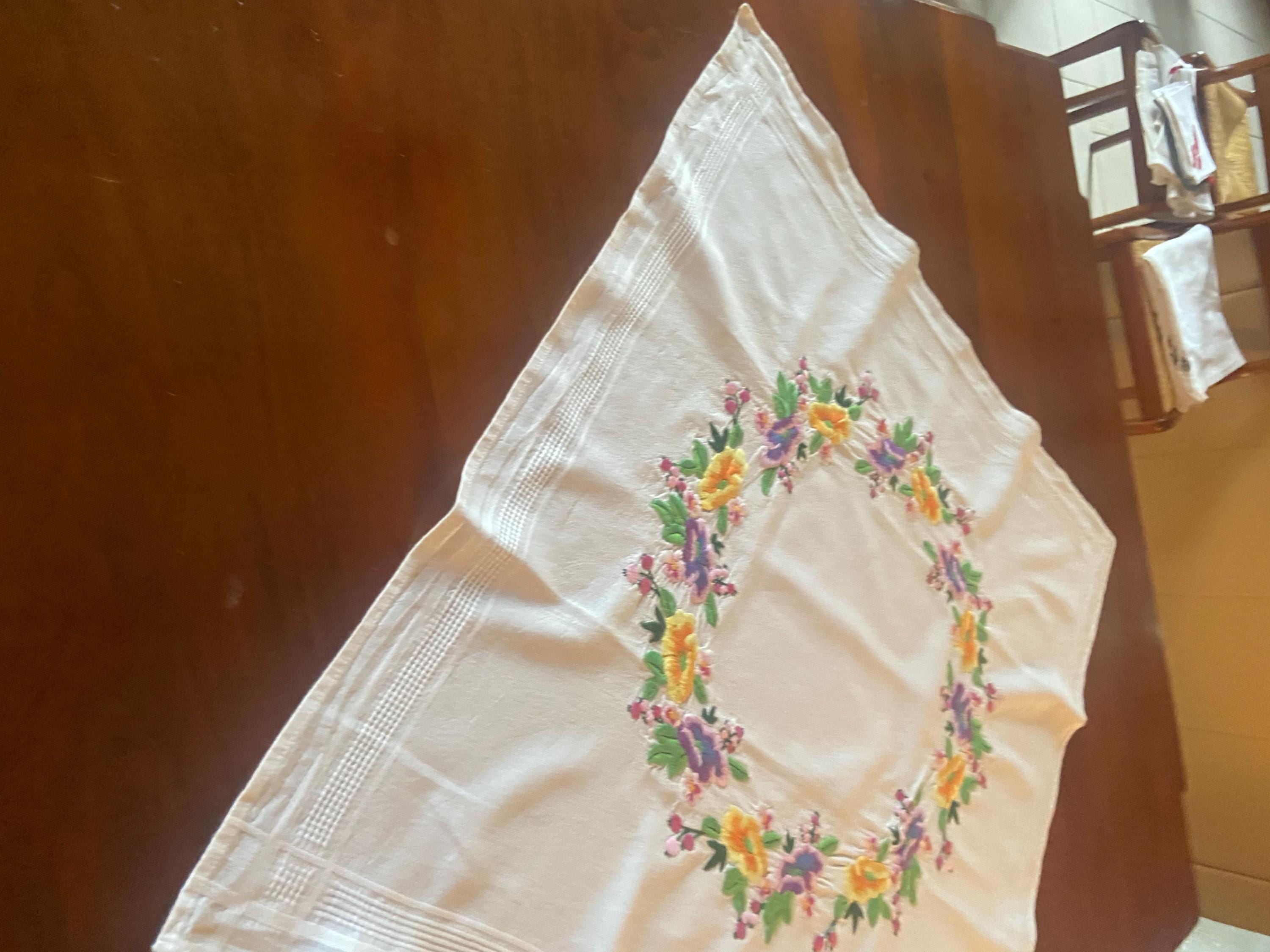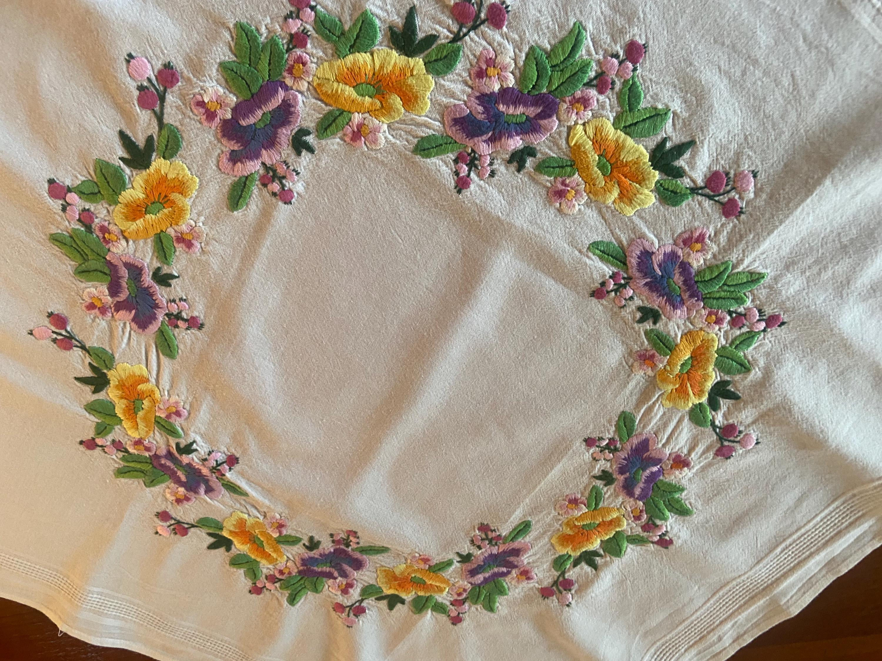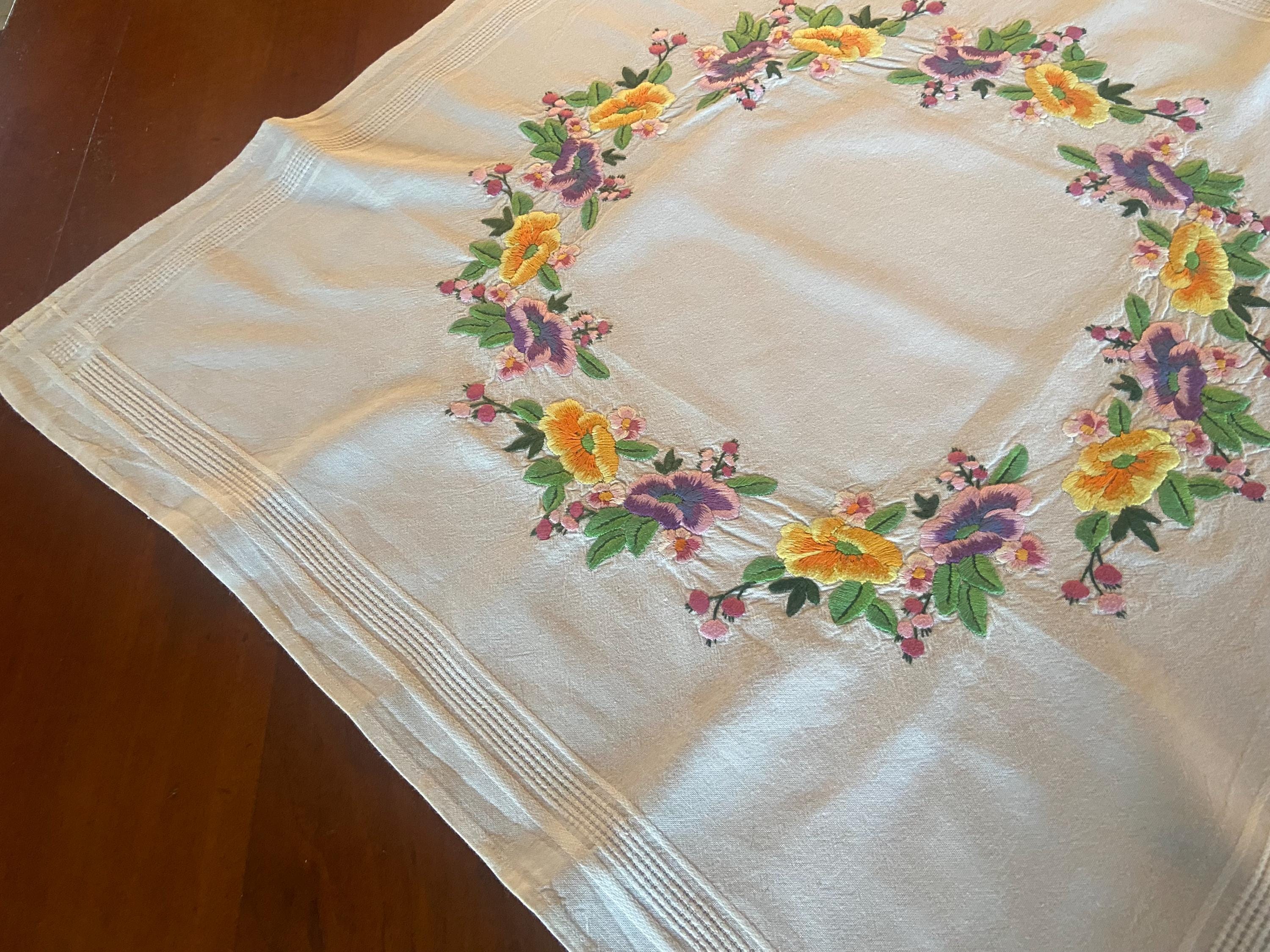 Hand embroidered tablecloth on white cotton background, 80x80, floral pattern