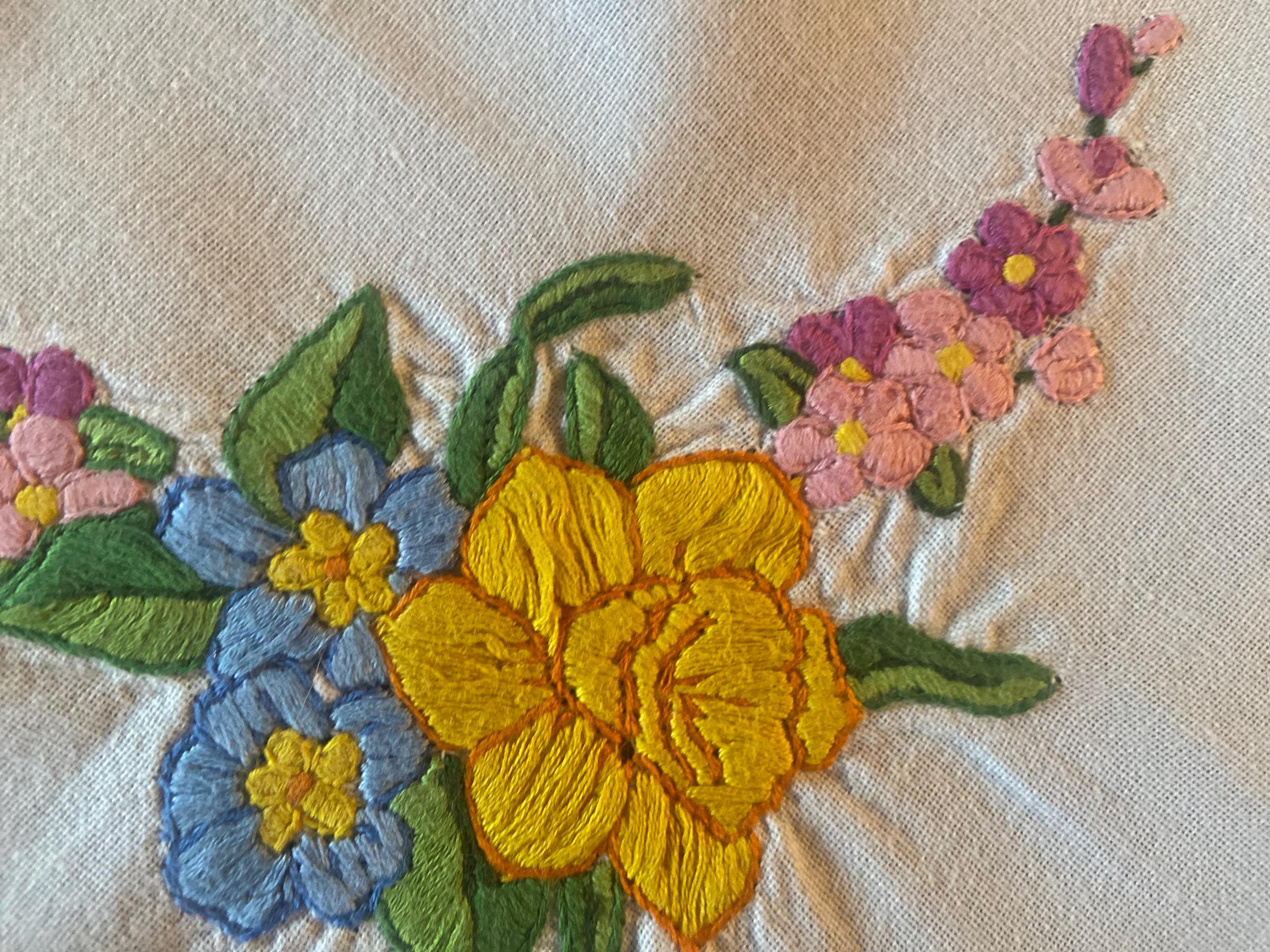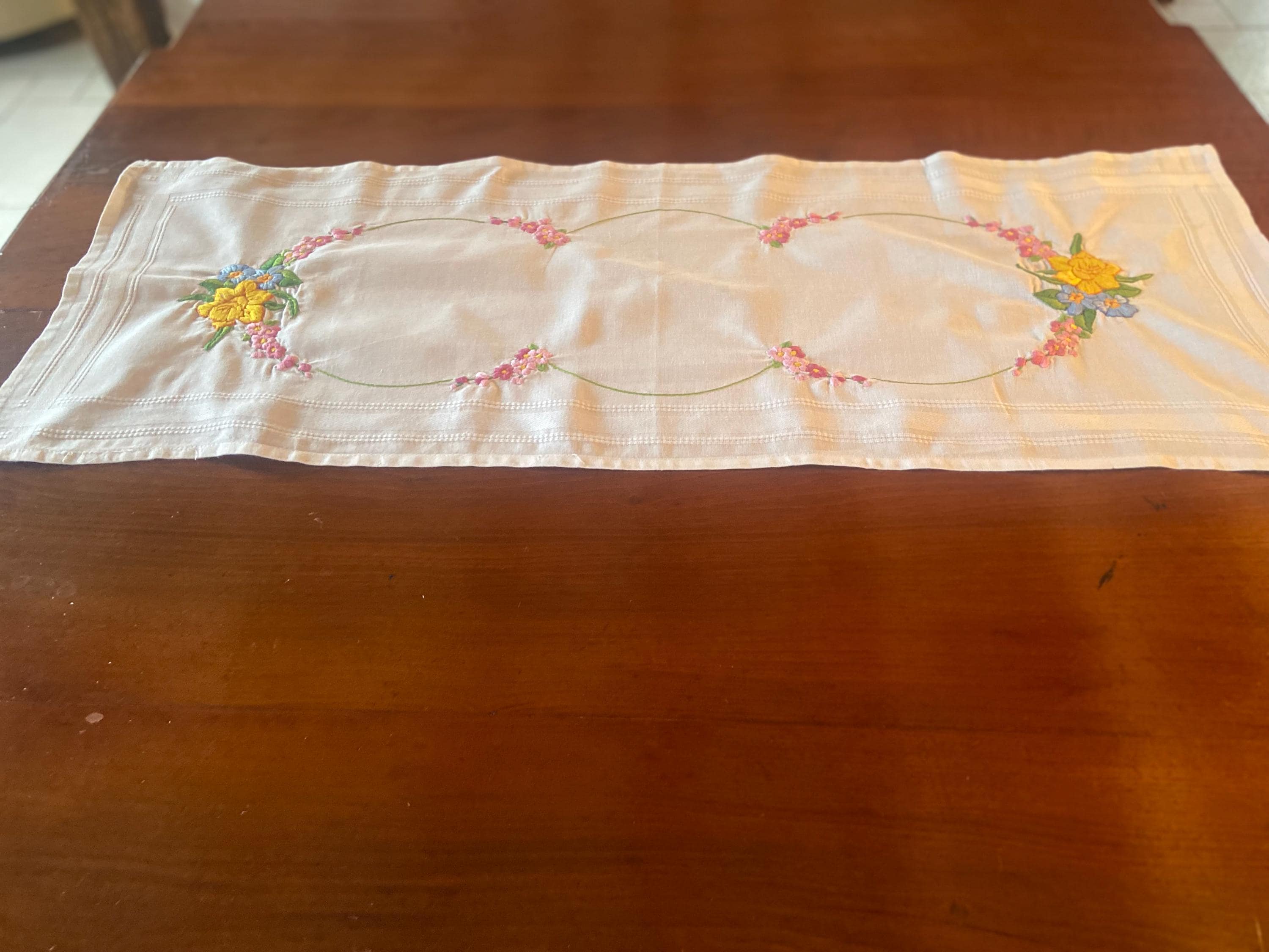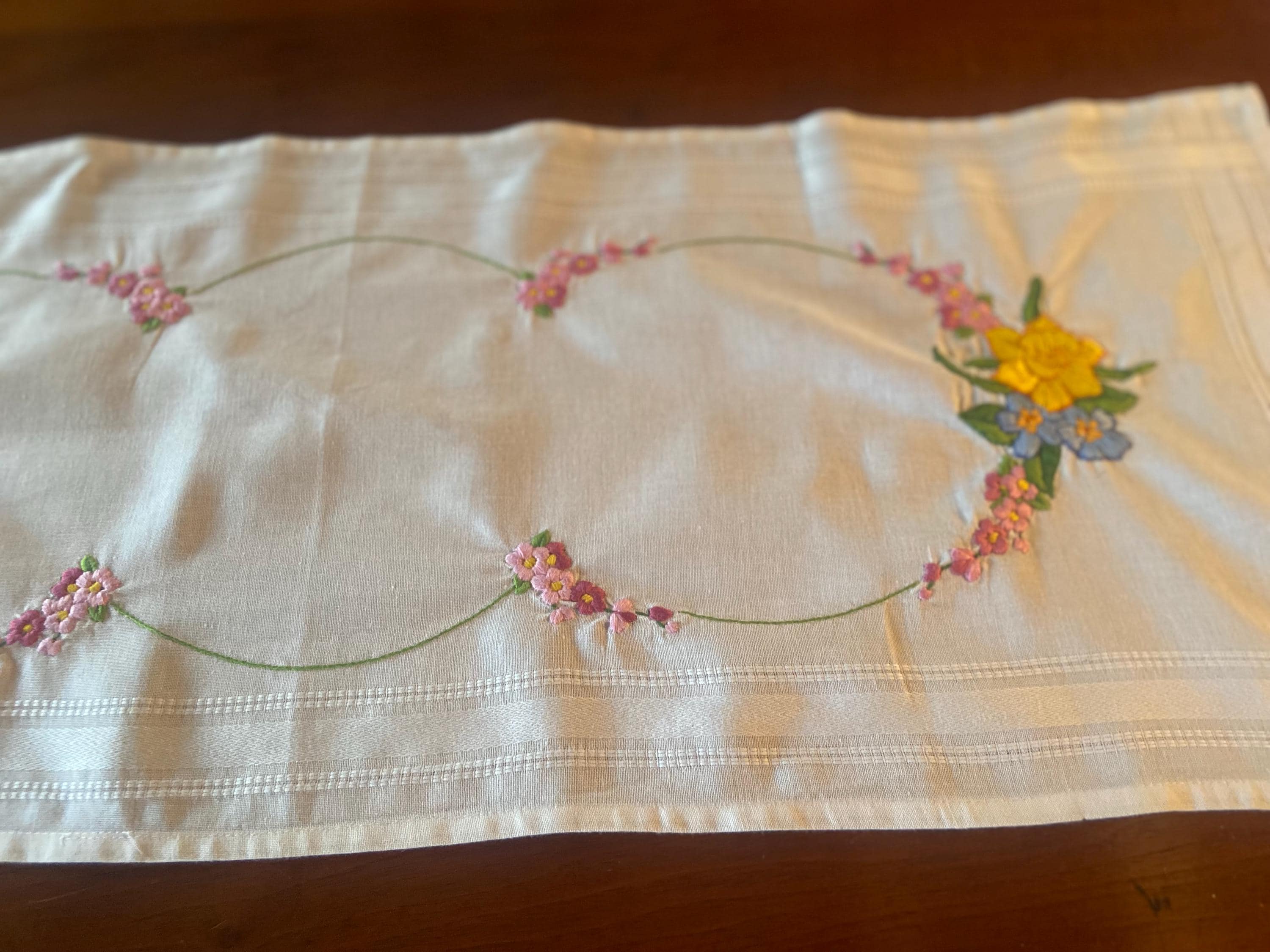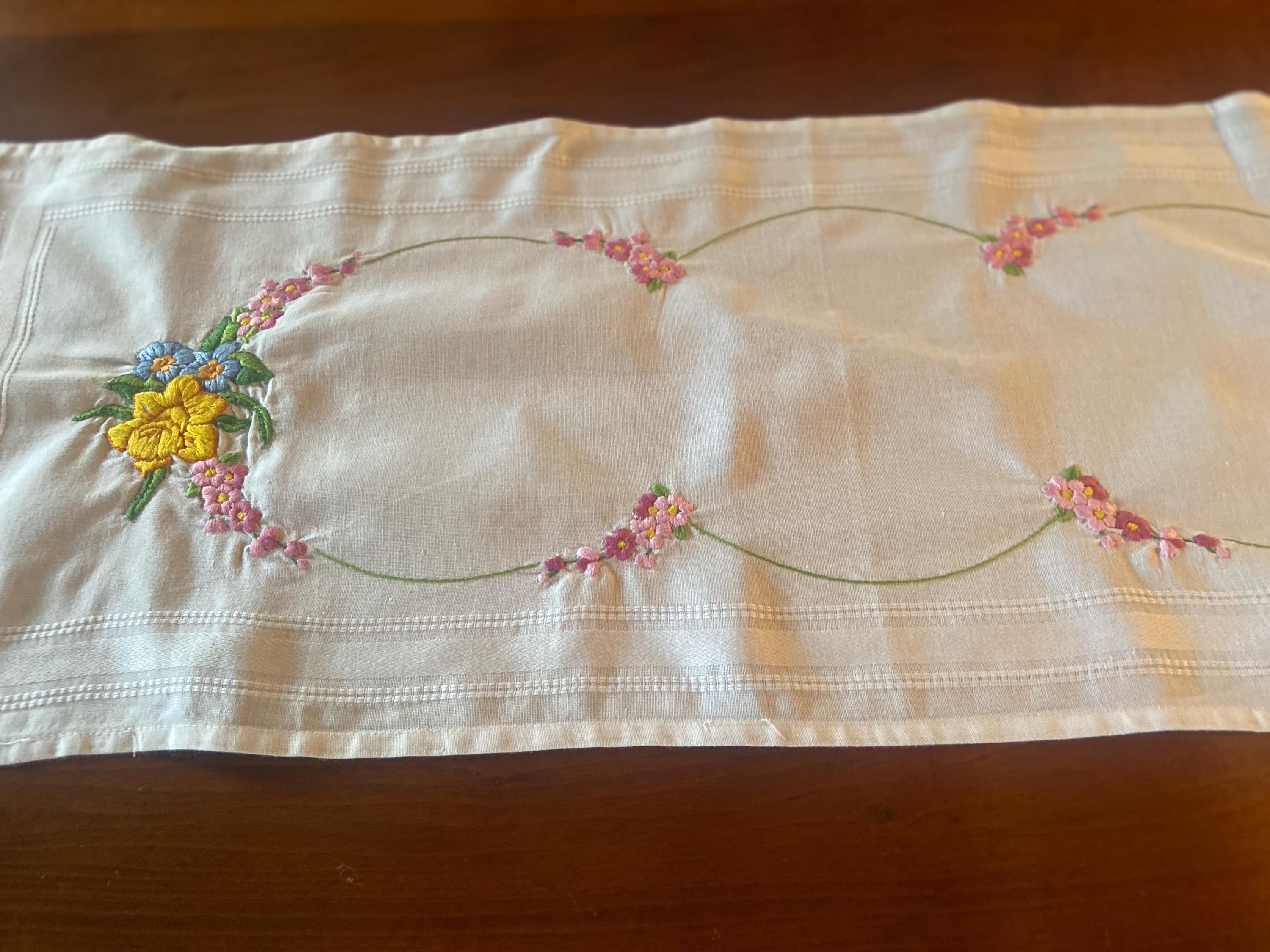 Hand embroidered table runner on white cotton background, 45x100, floral pattern