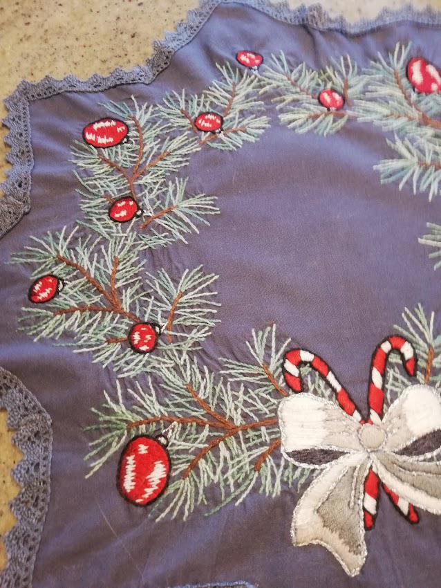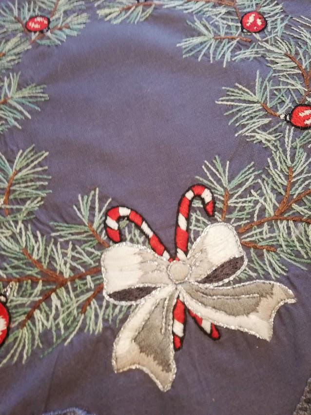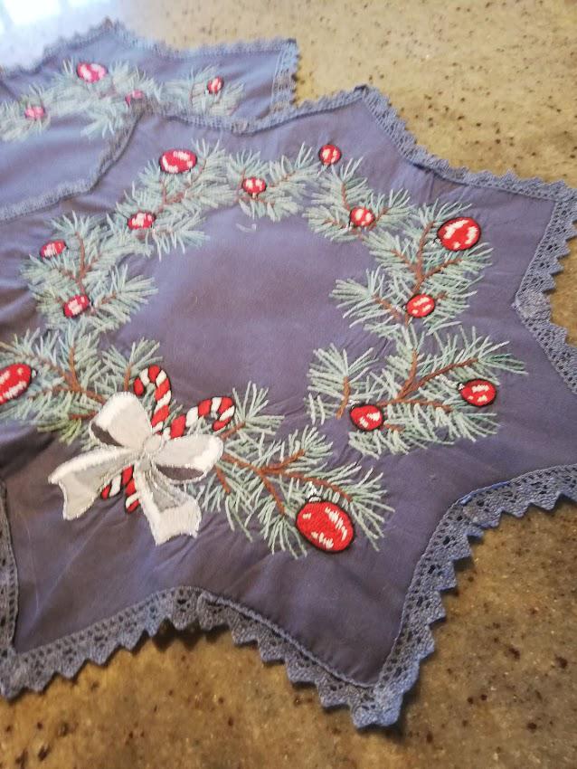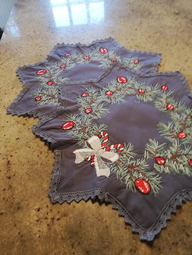 4 hand-embroidered placemats on a gray cotton background, Christmas atmosphere