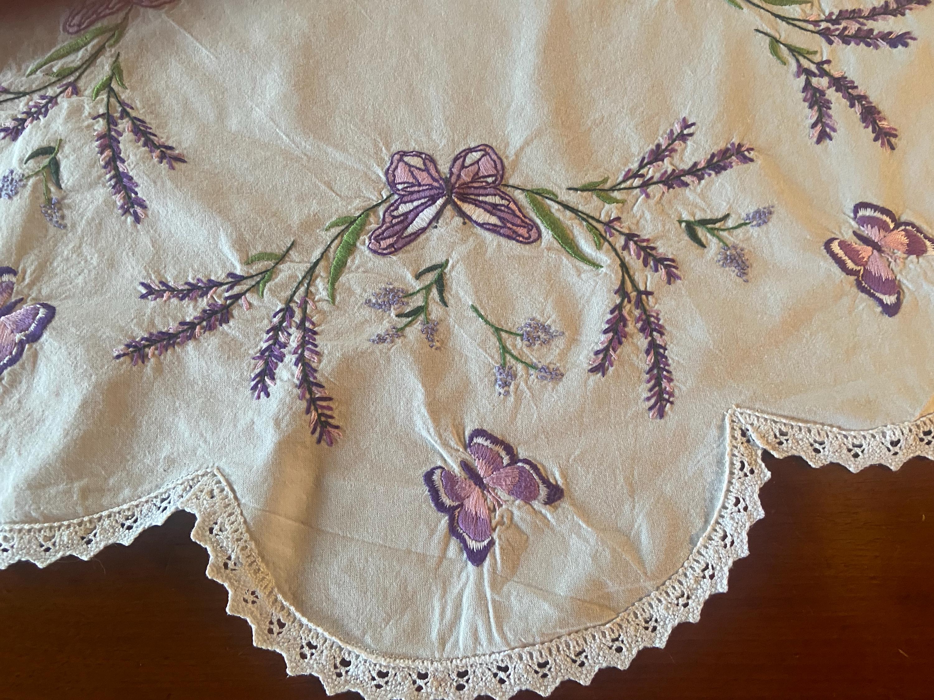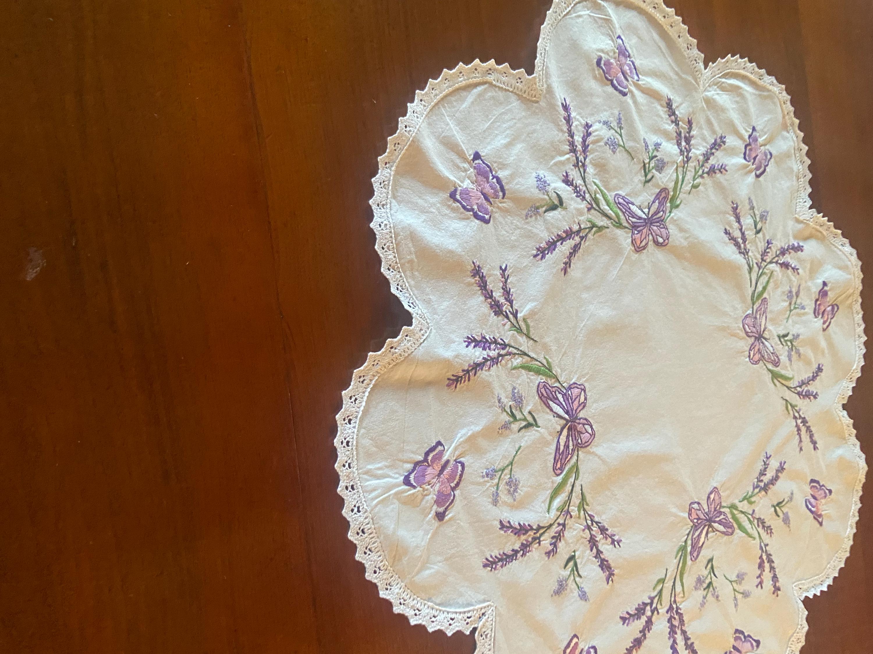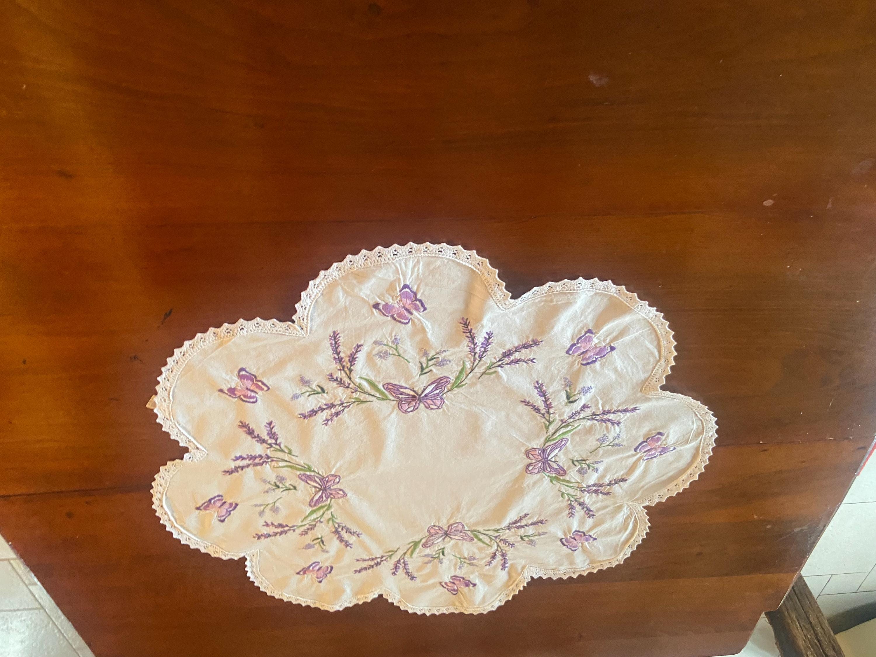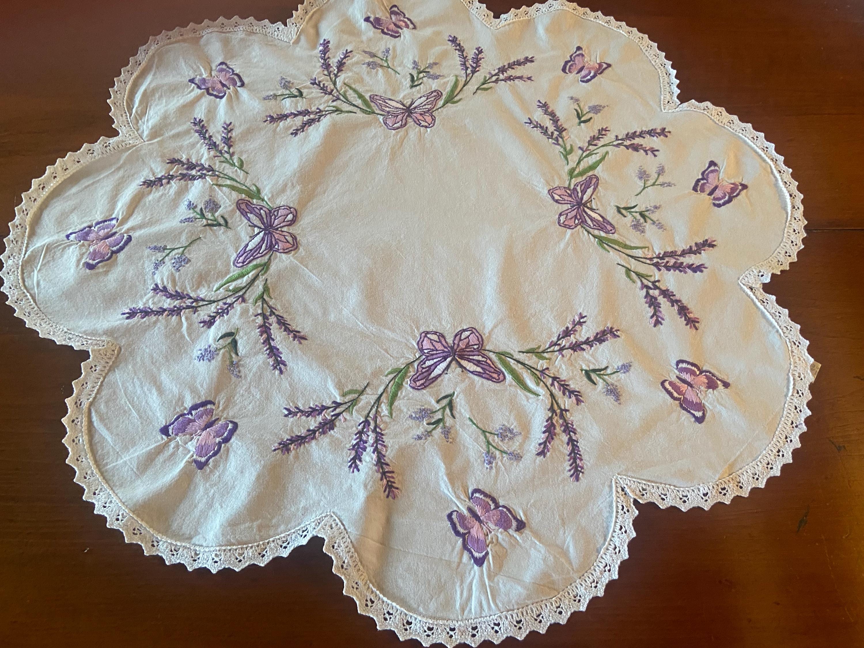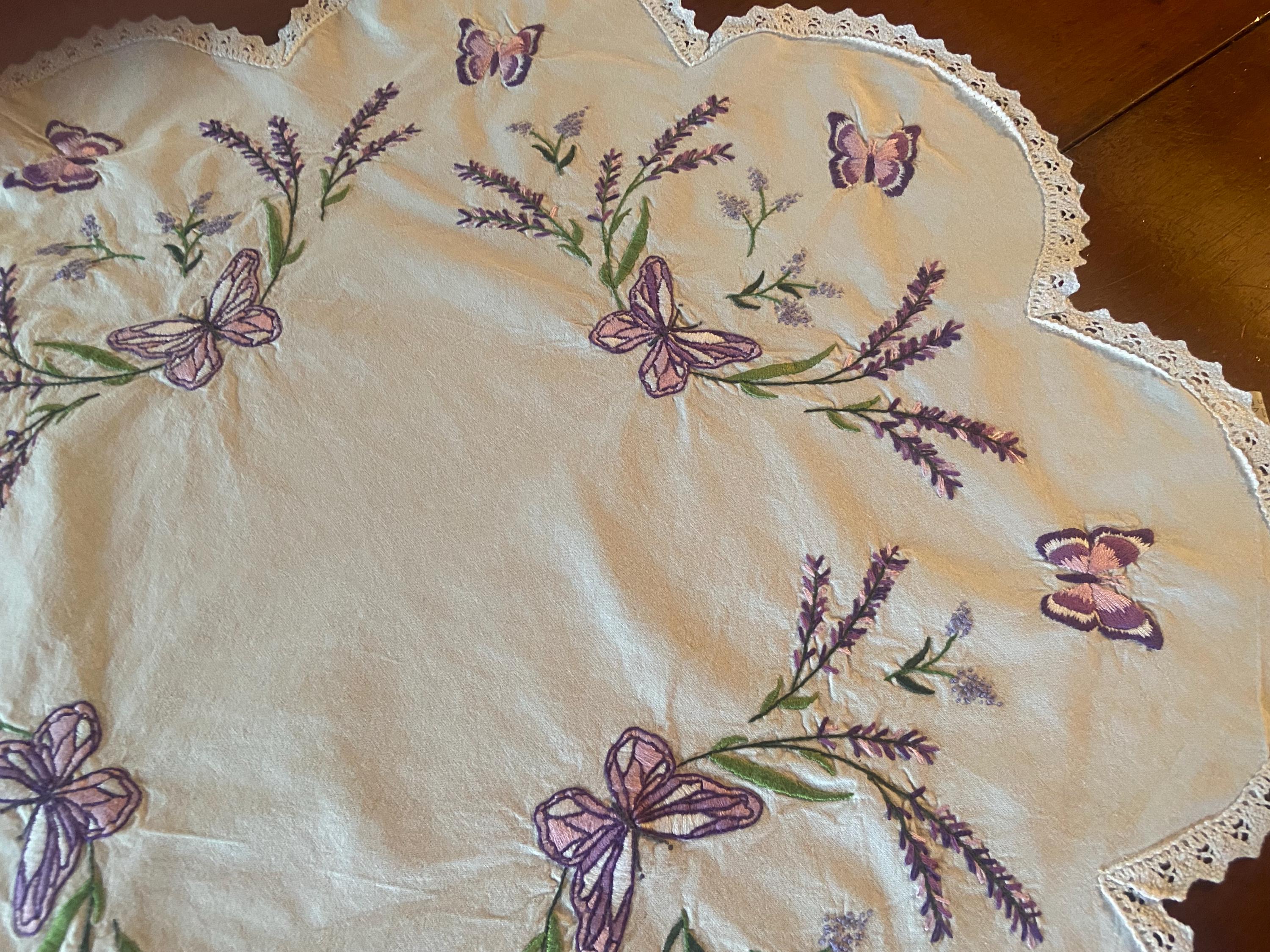 Hand embroidered doily on white background, edged with lace, 50x50, butterfly motif