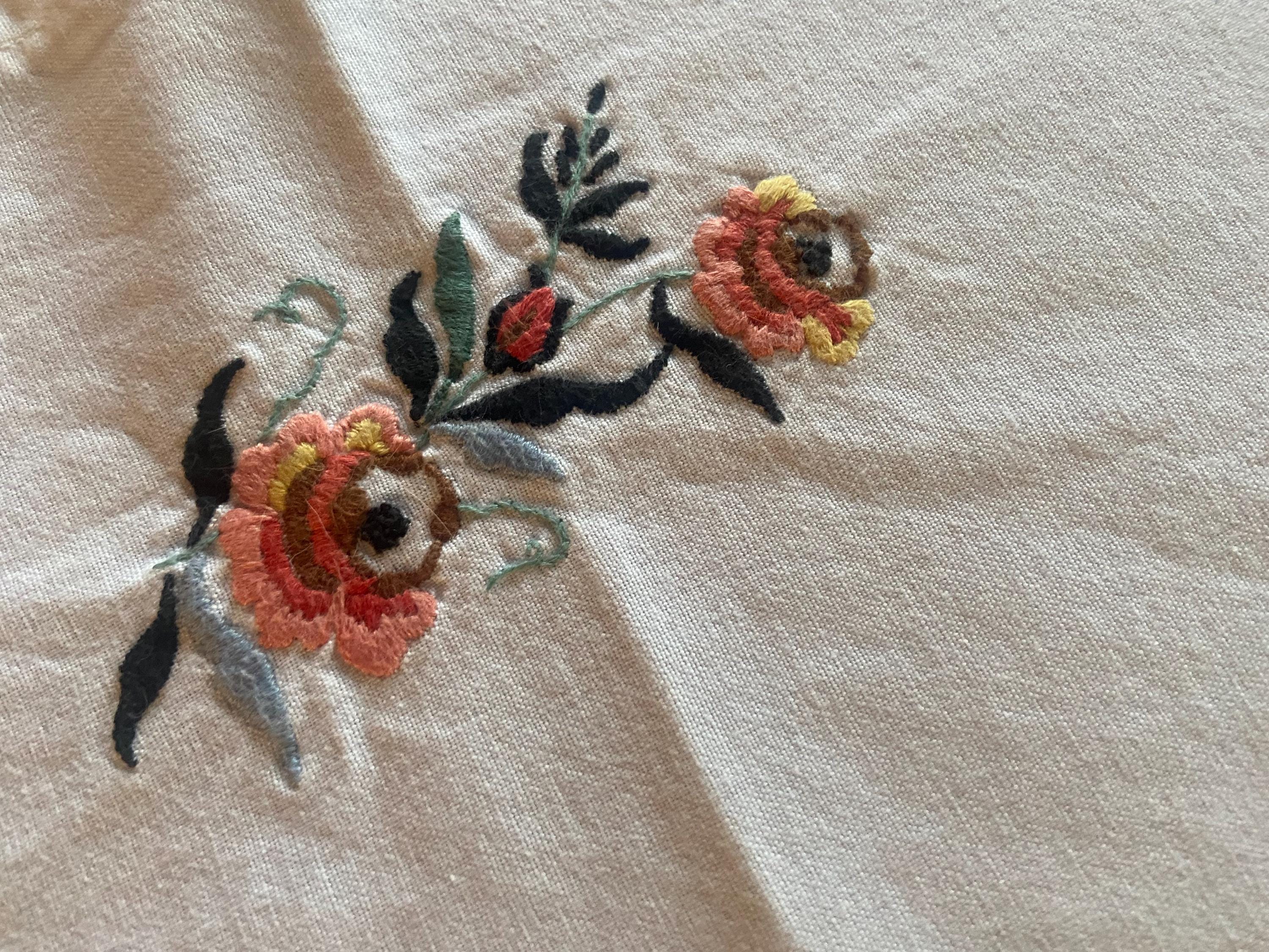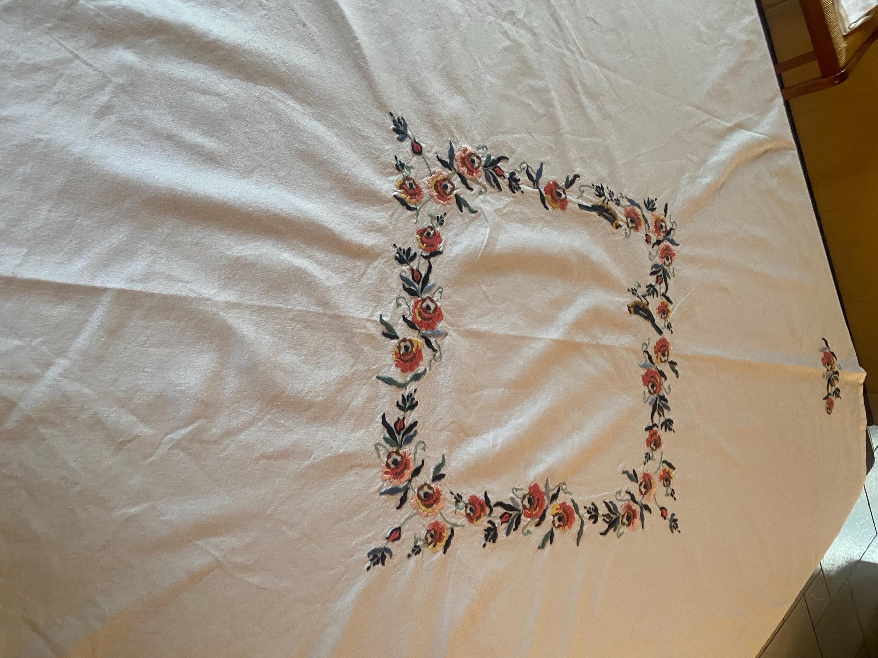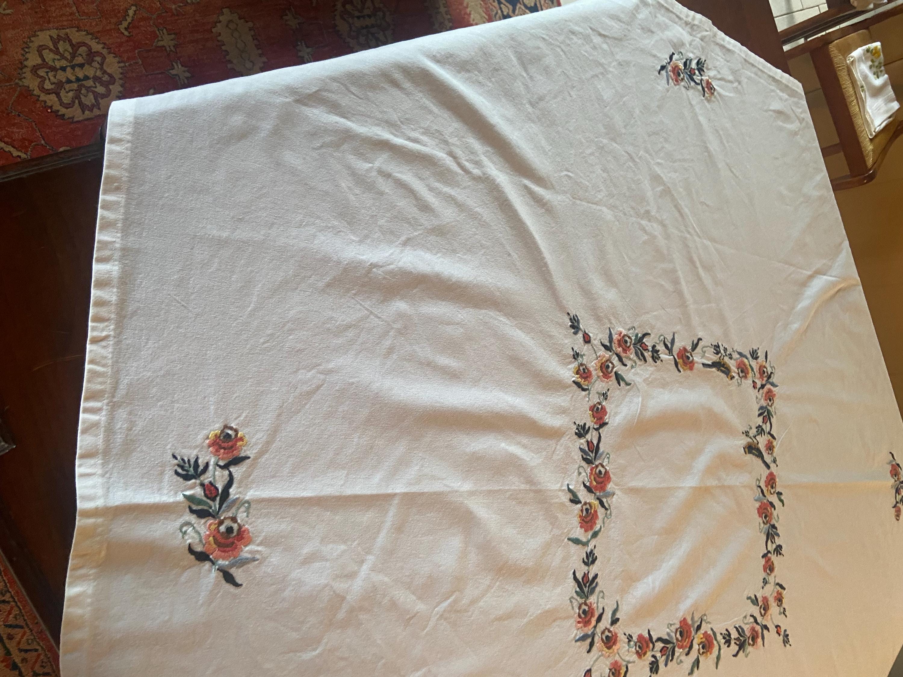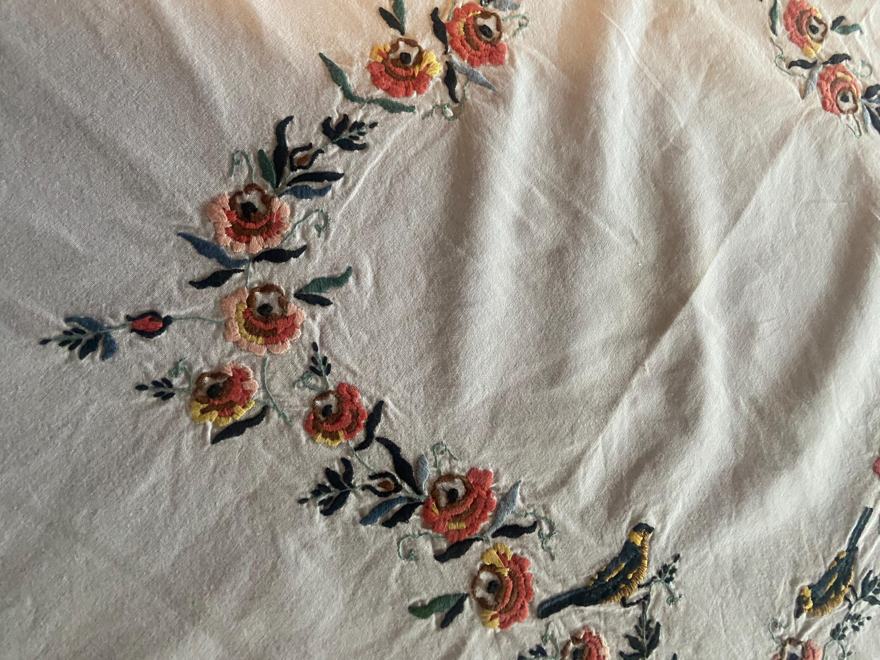 Hand embroidered tablecloth on white cotton background, 150x150cm, flower and bird pattern