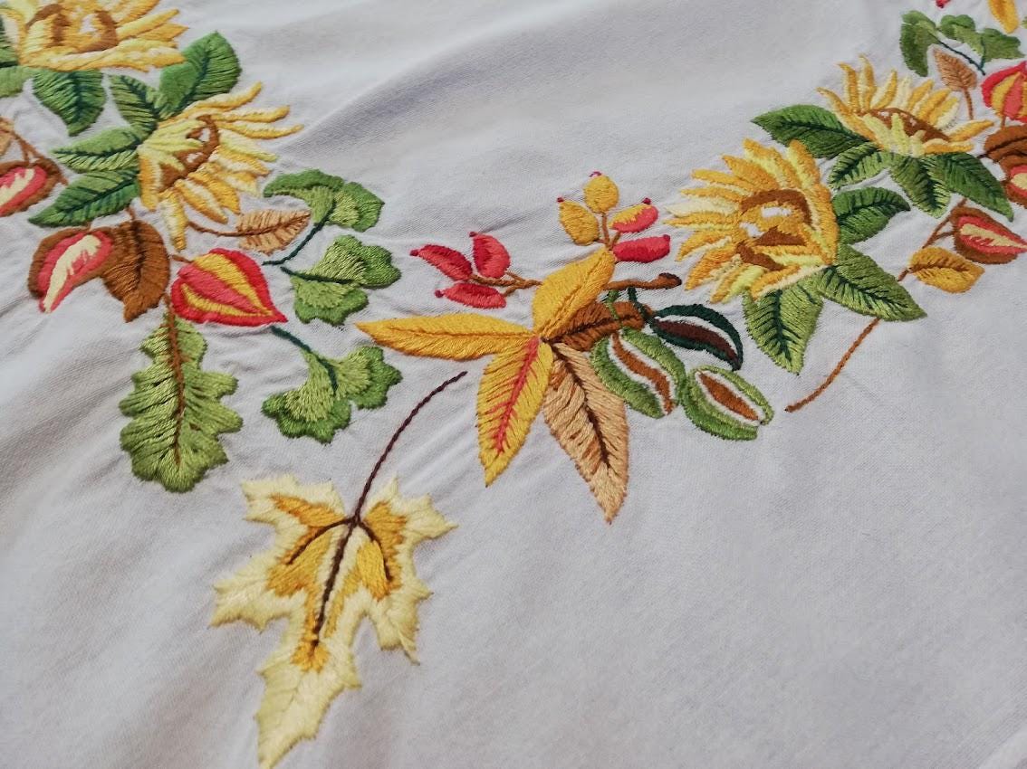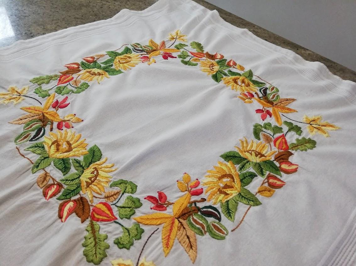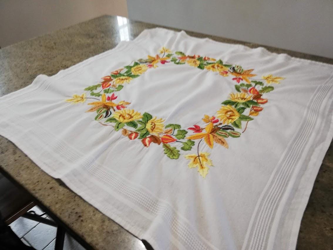Hand embroidered tablecloth on white cotton background, 80x80, floral pattern