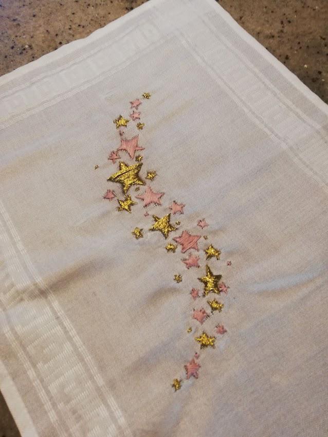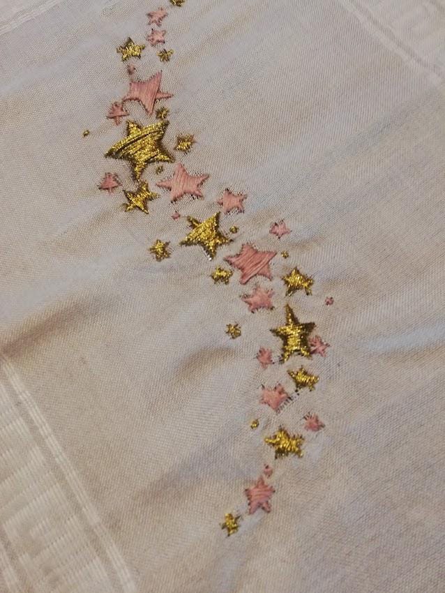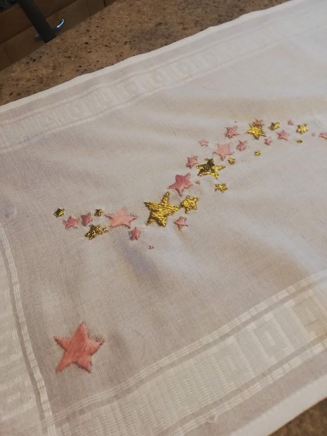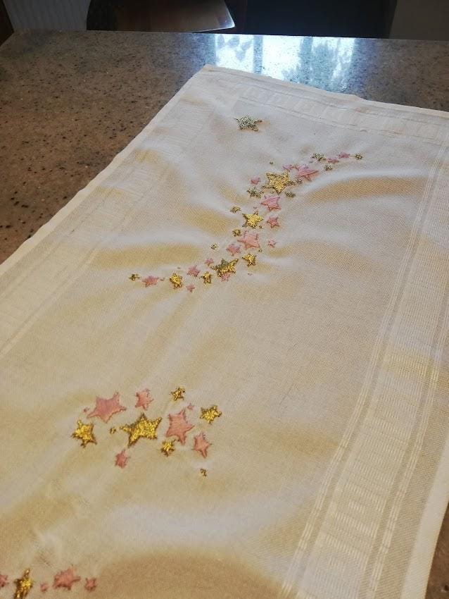 Hand embroidered table runner on white polyester background, 80x80, star pattern