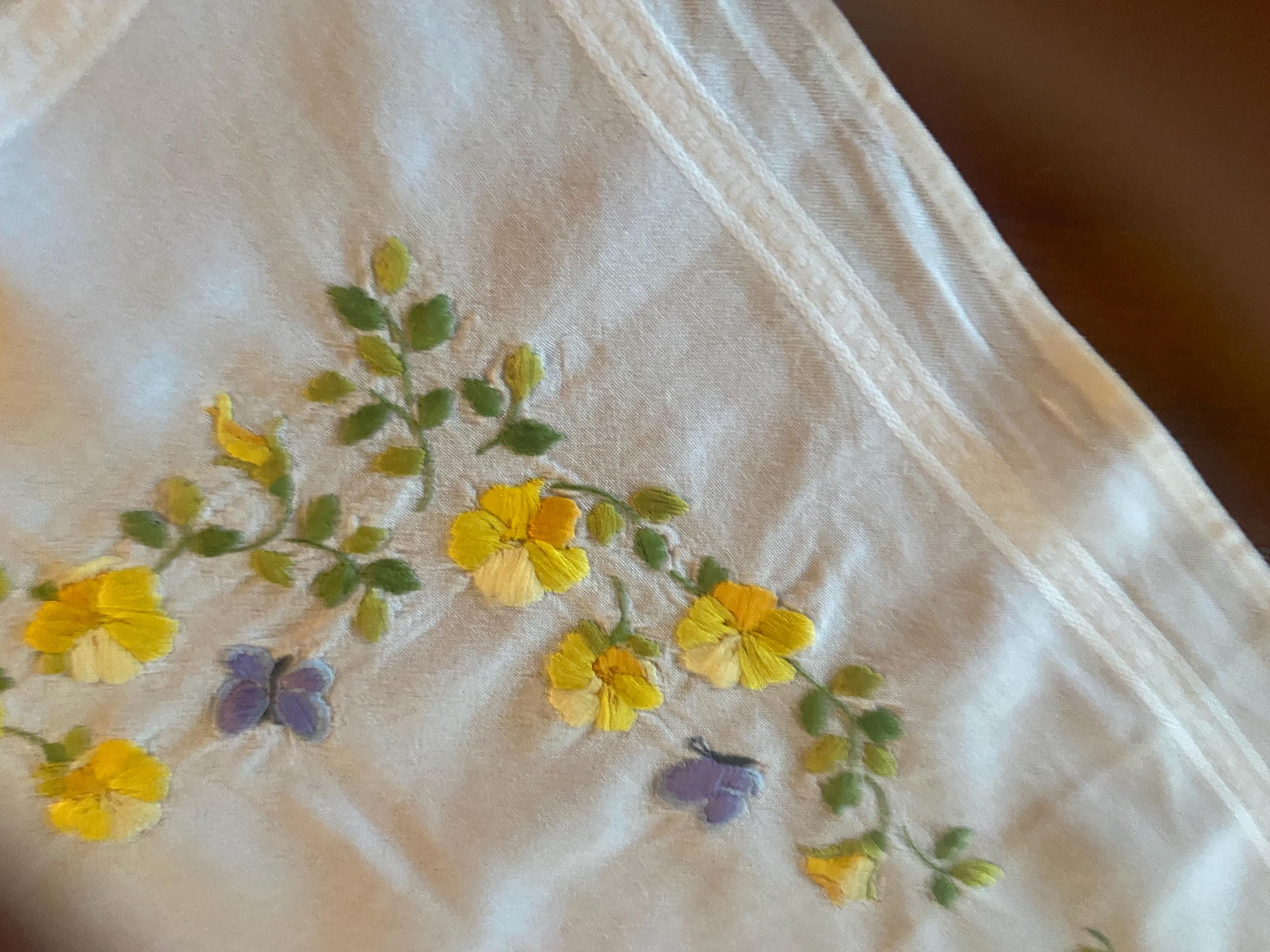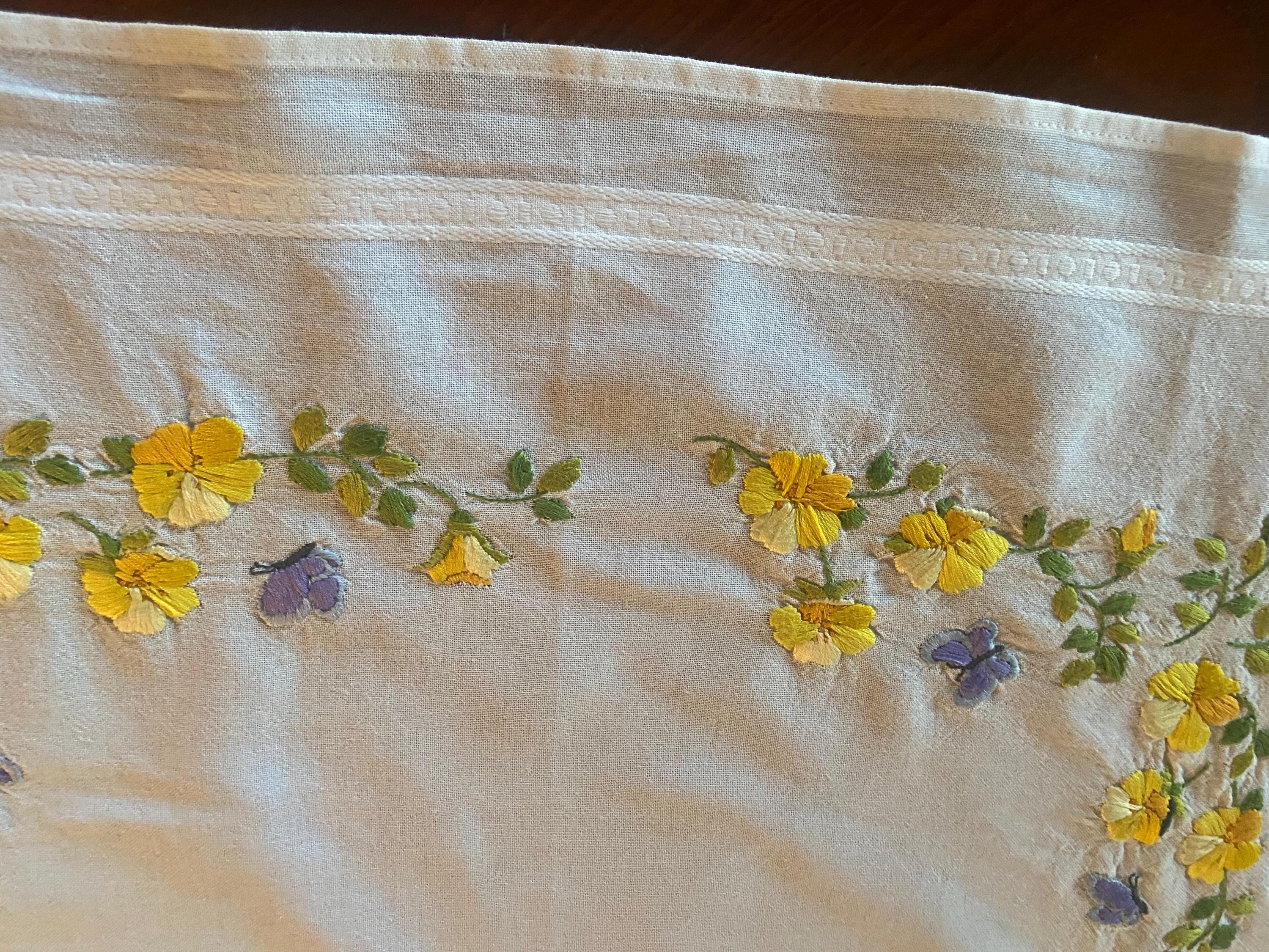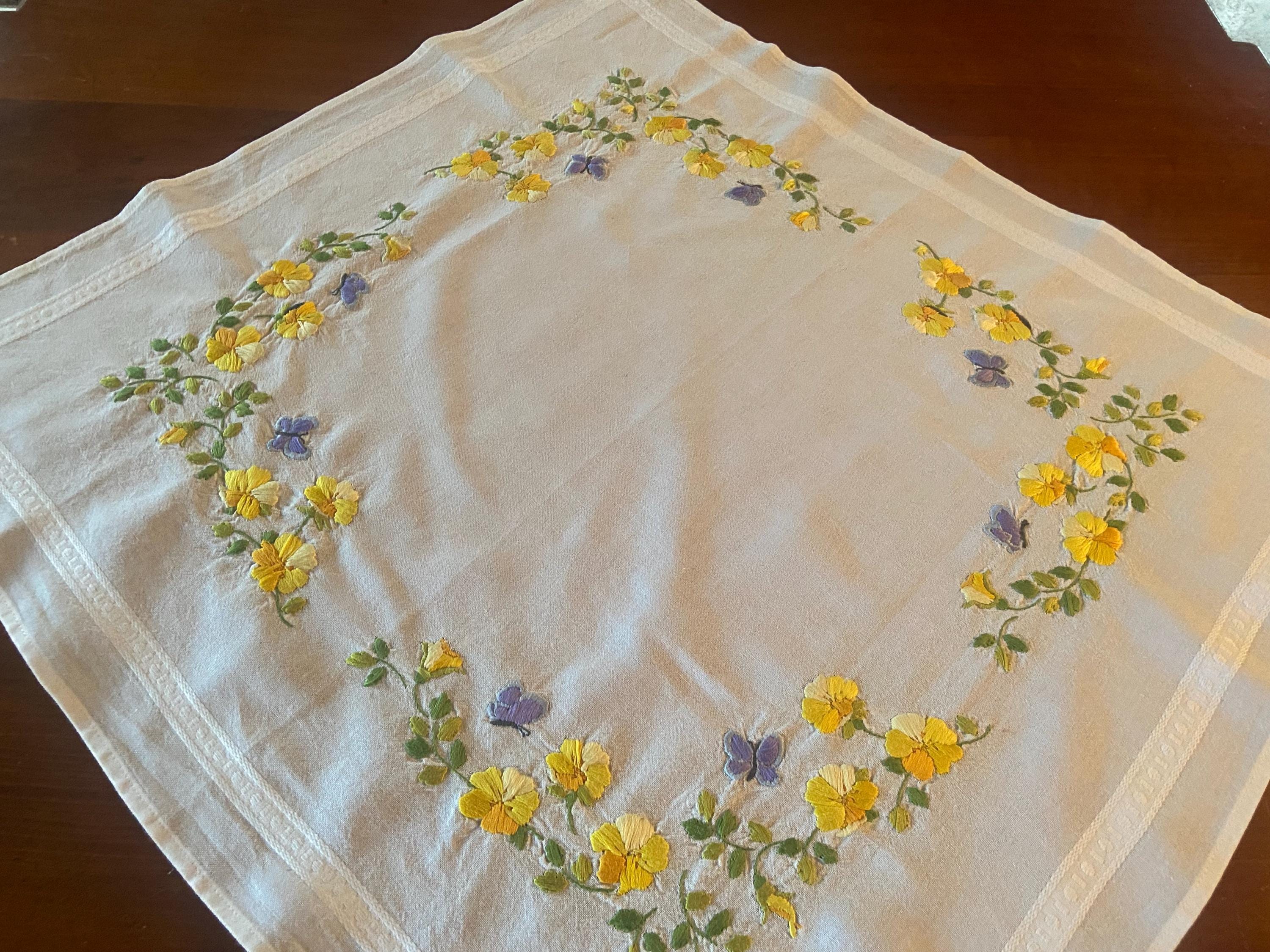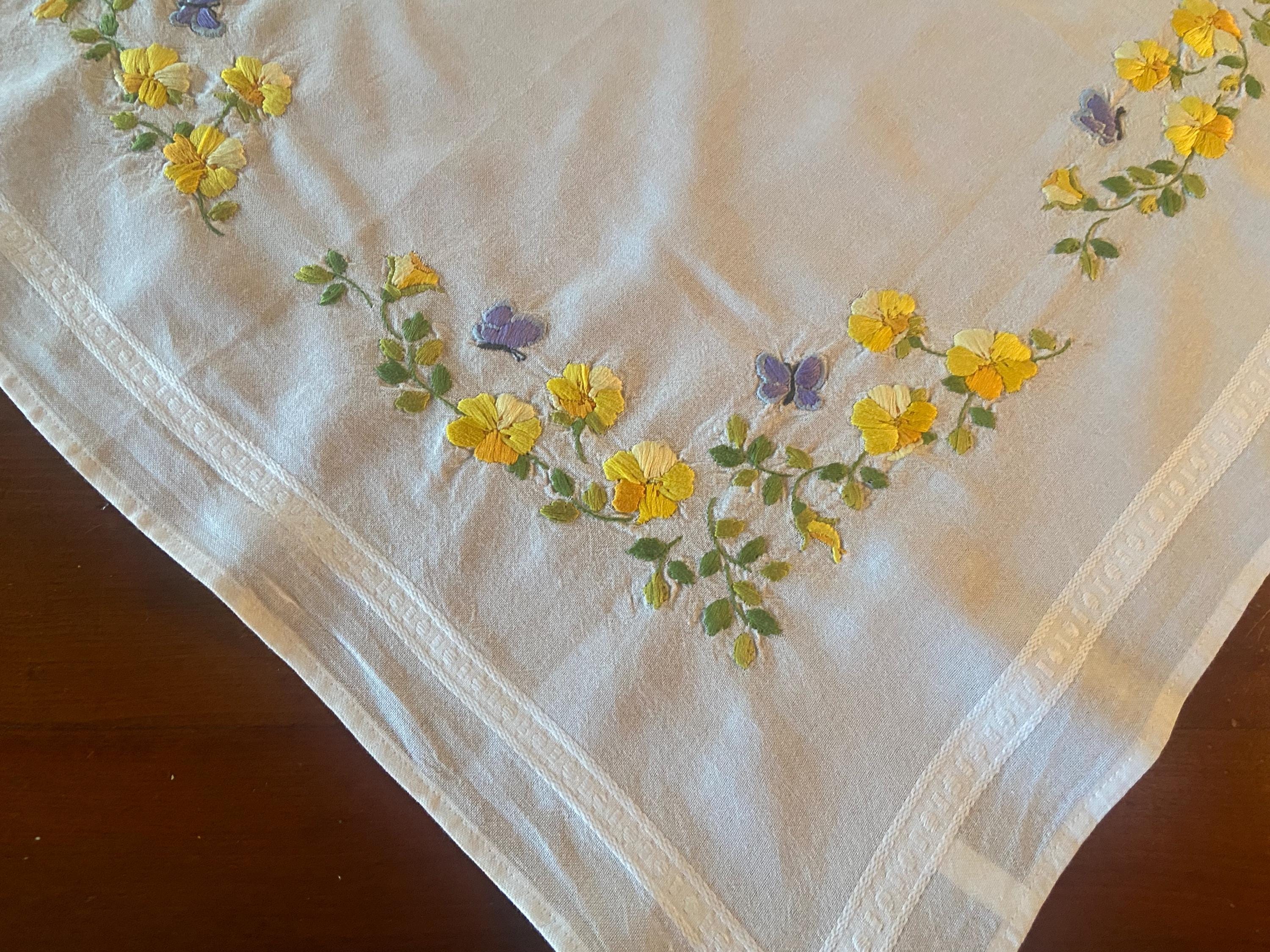 Hand-embroidered cotton tablecloth, 80x80 cm, flowers and butterflies