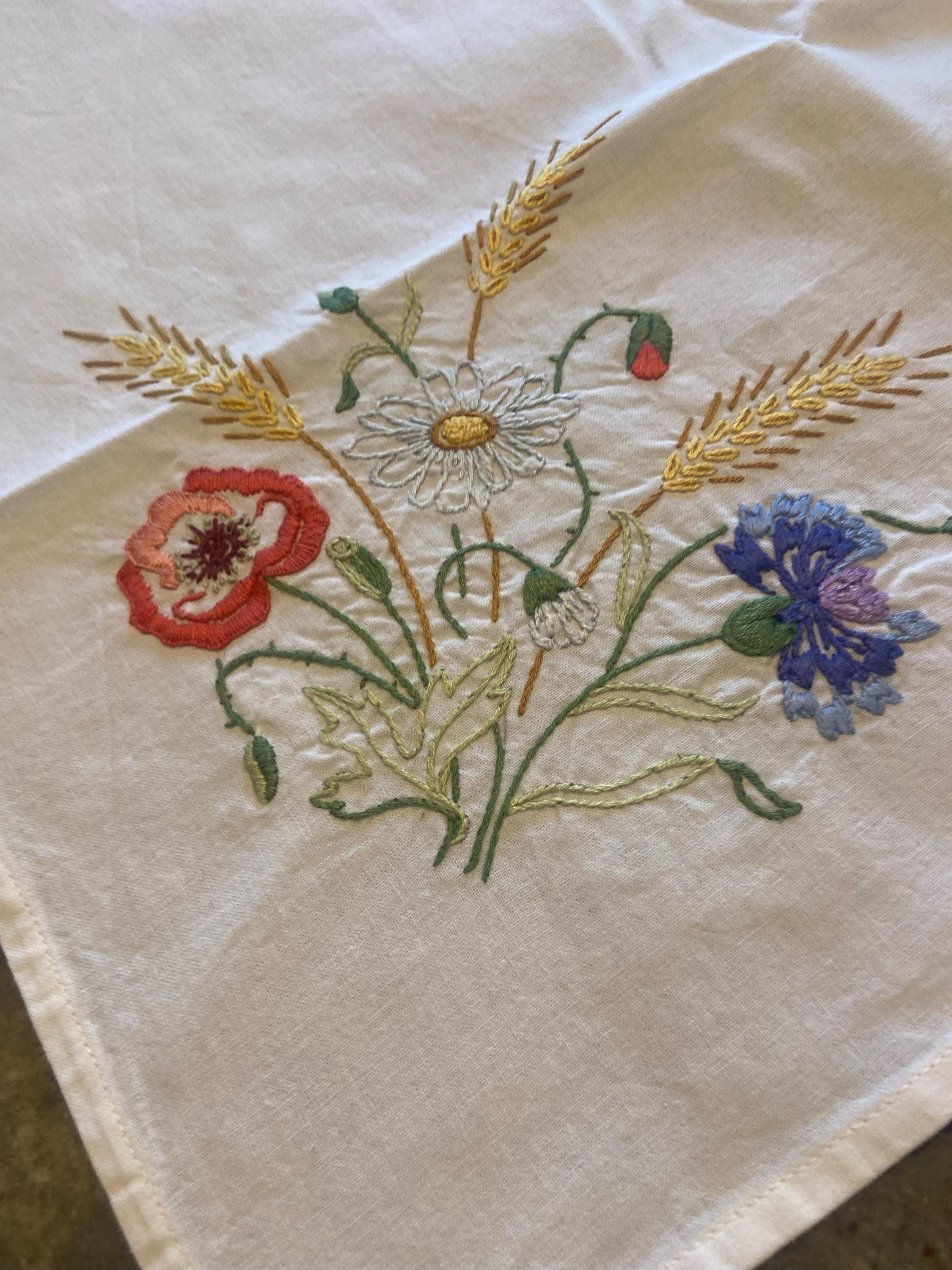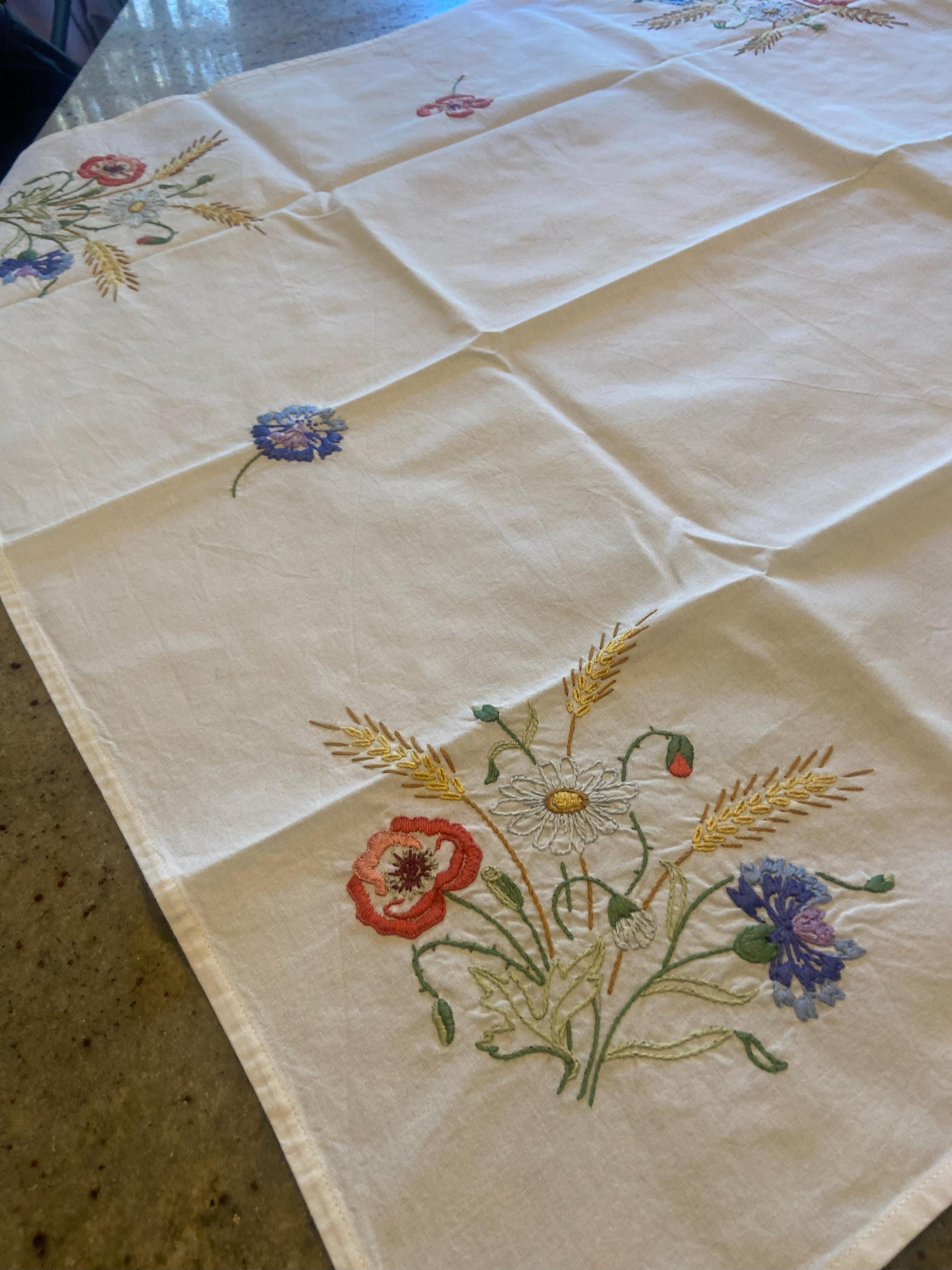 Hand-embroidered cotton tablecloth, 80x80 cm, wildflower pattern