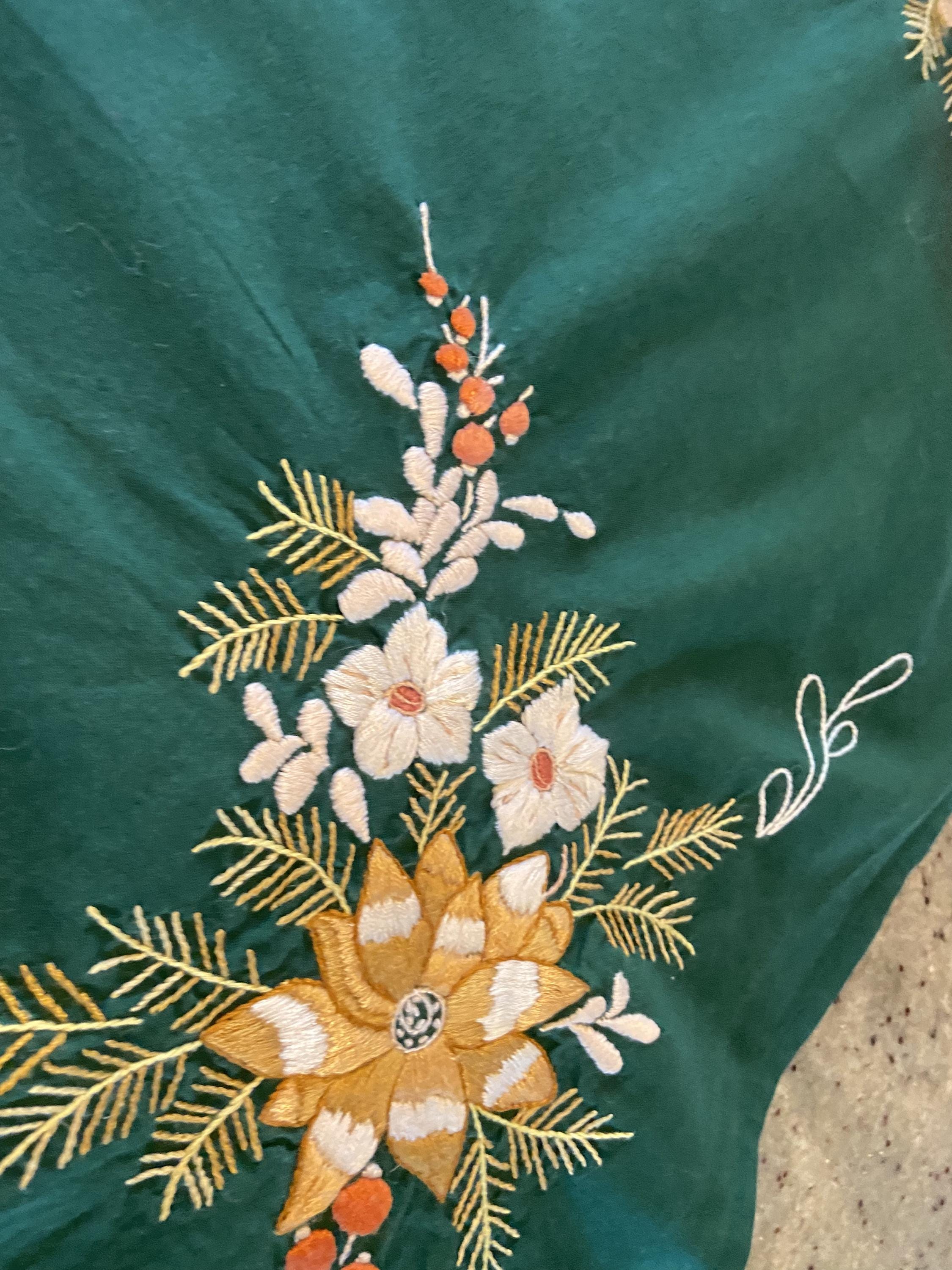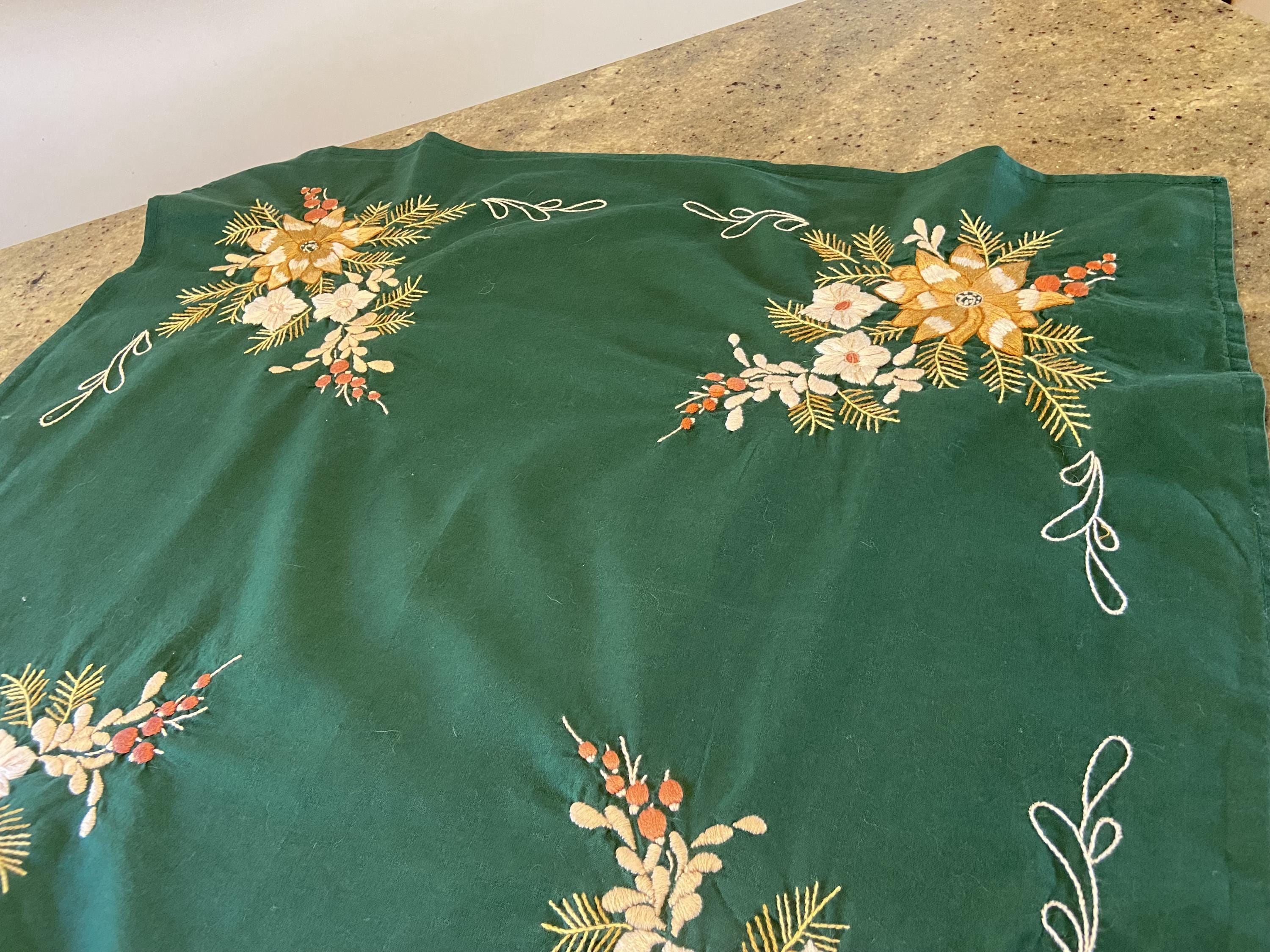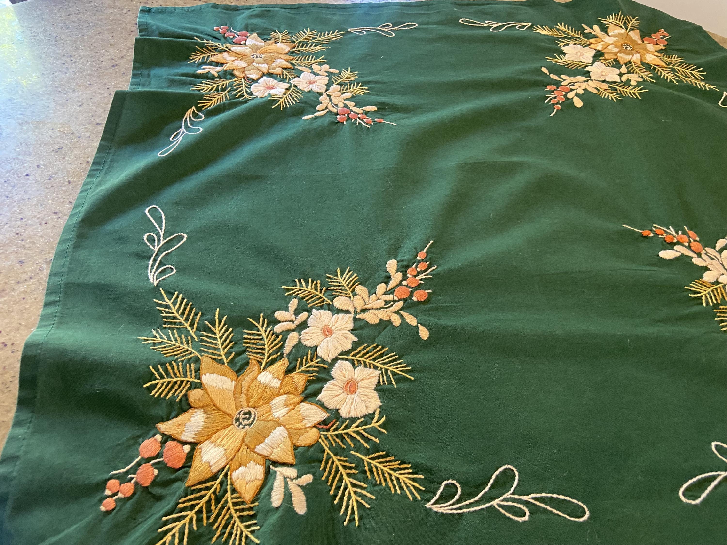 Hand-embroidered cotton tablecloth, 70x70 cm, green background, autumnal theme