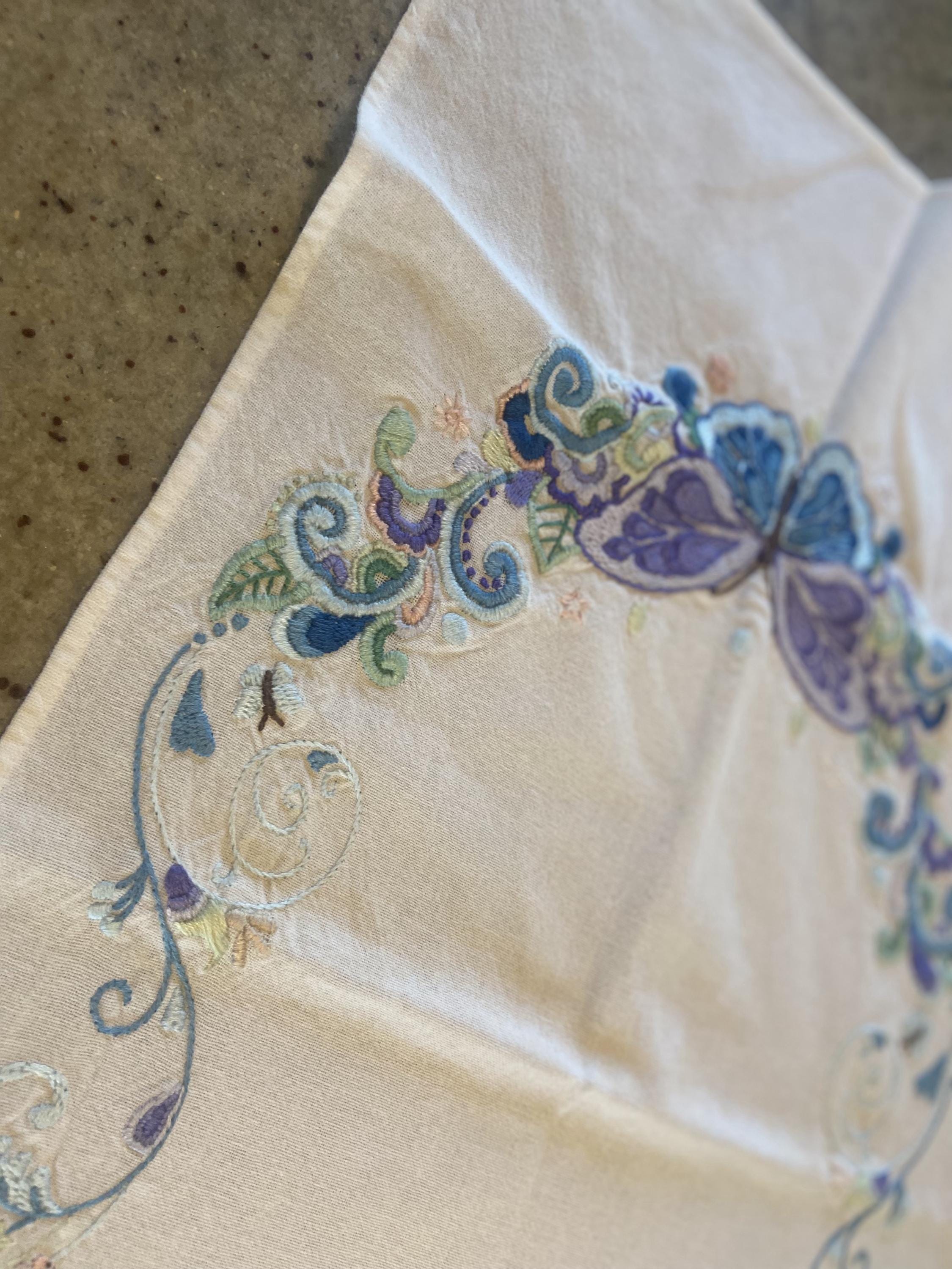Hand-embroidered table runner, white cotton background, 140x40 cm, butterfly motifs