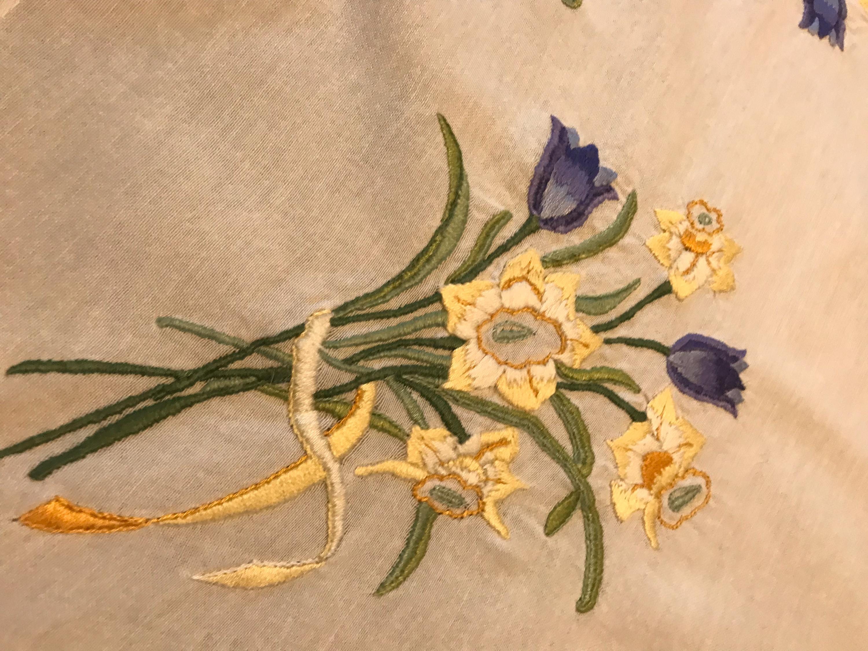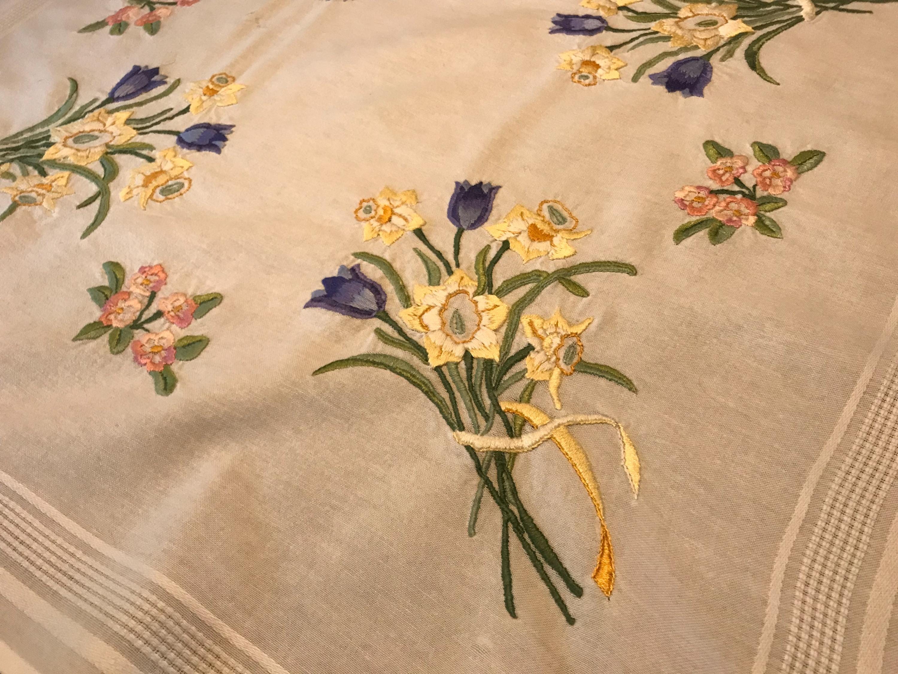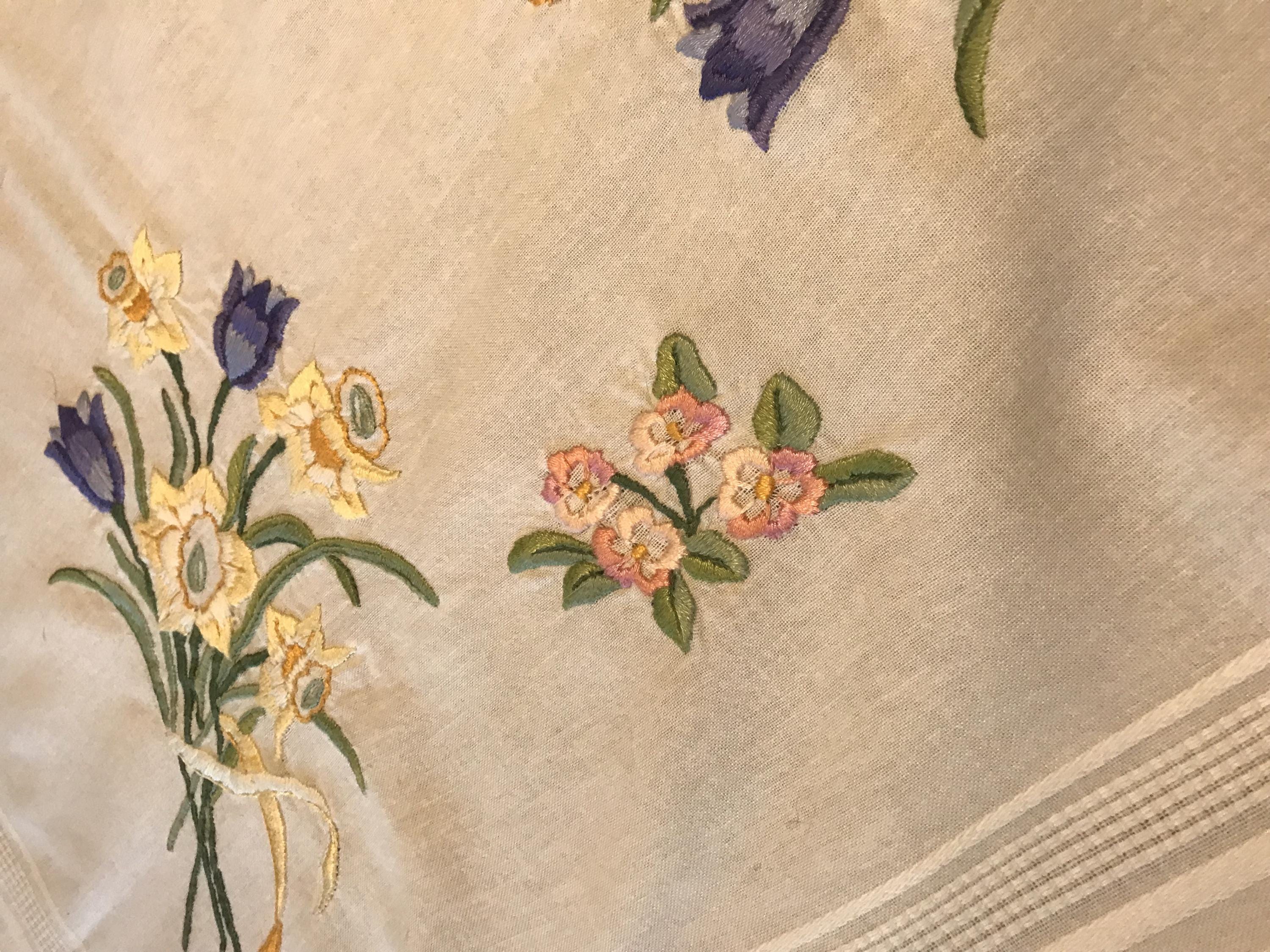 Hand-embroidered tablecloth, white cotton background, 80x80 cm, floral design