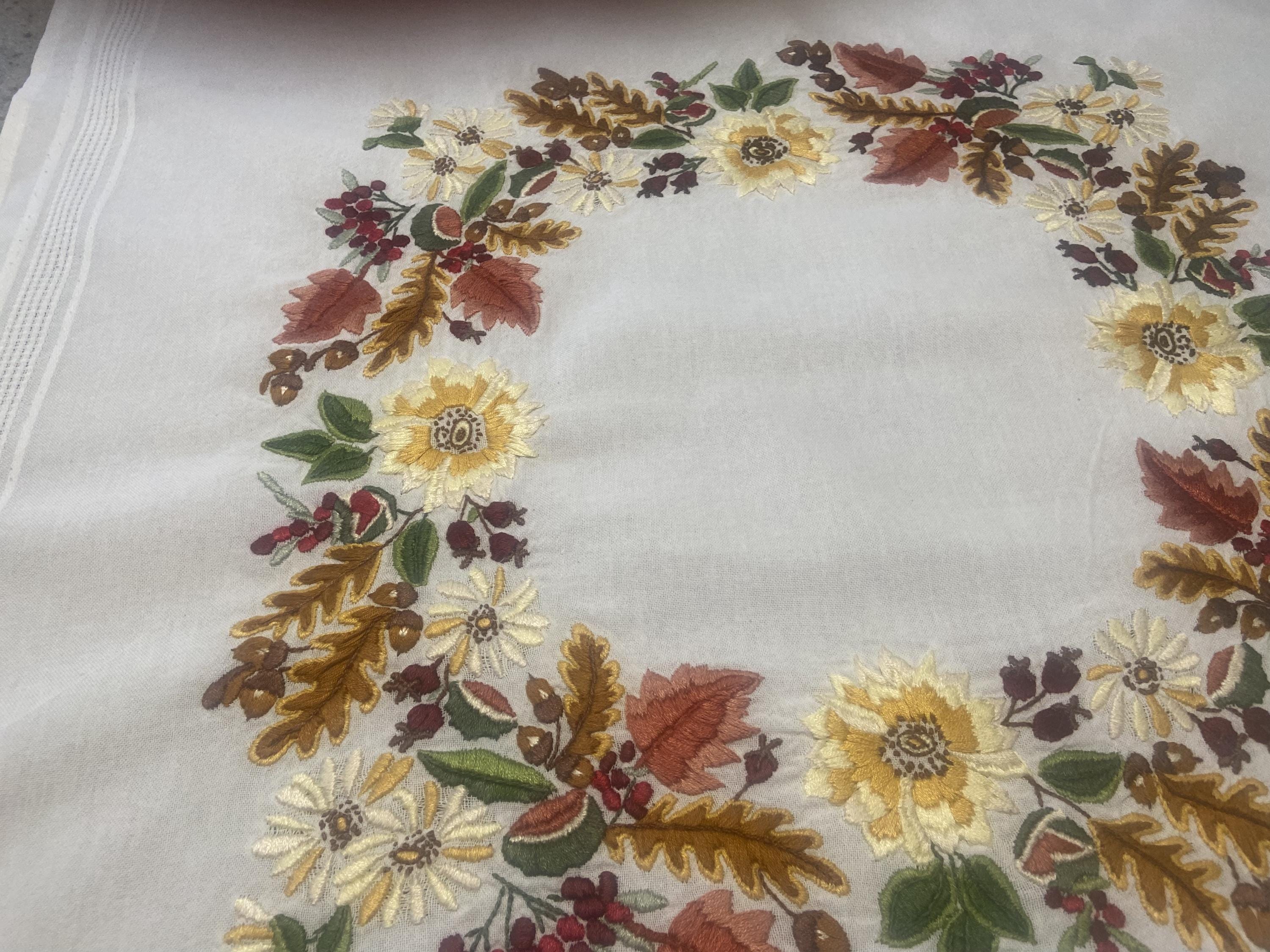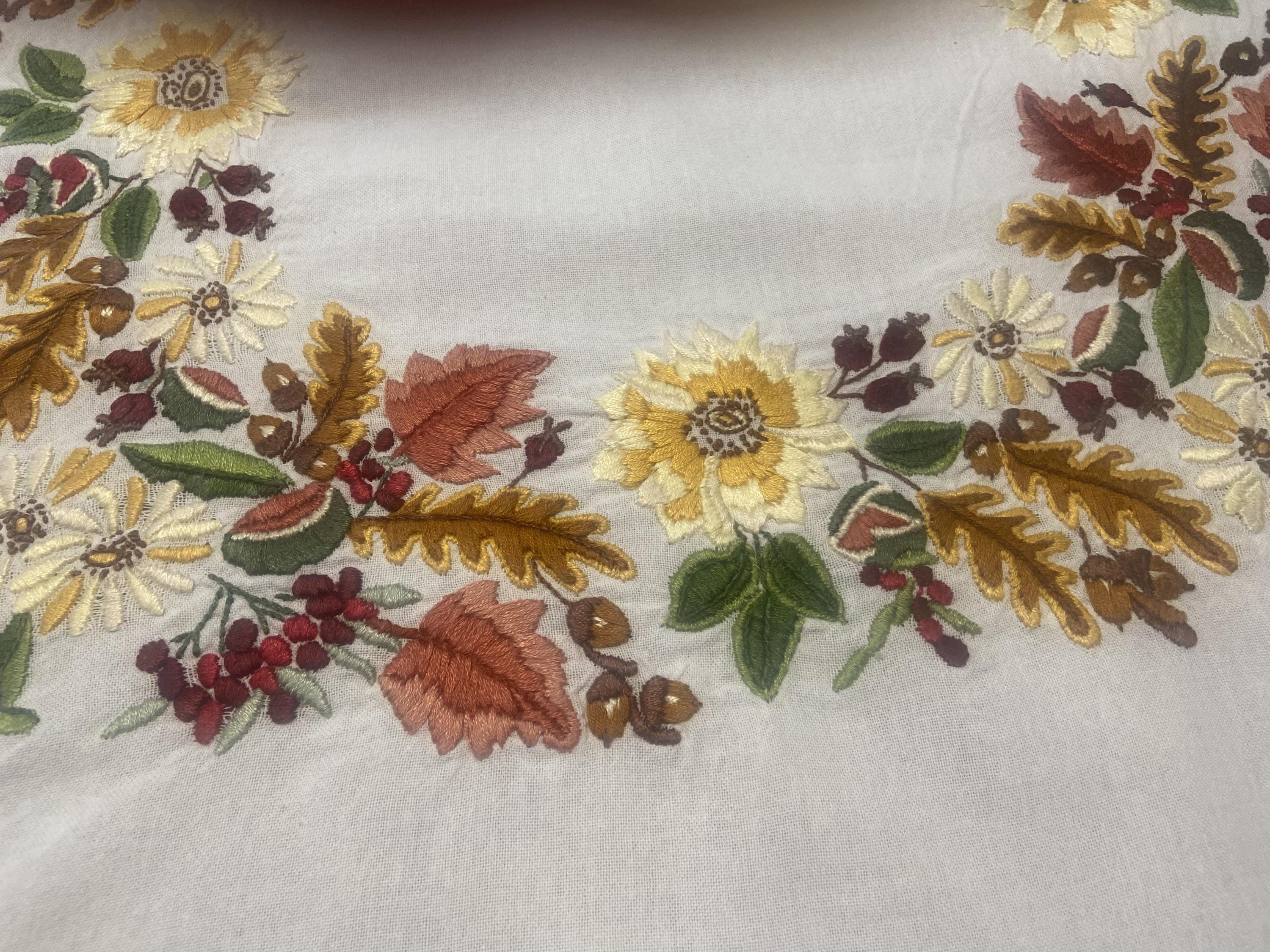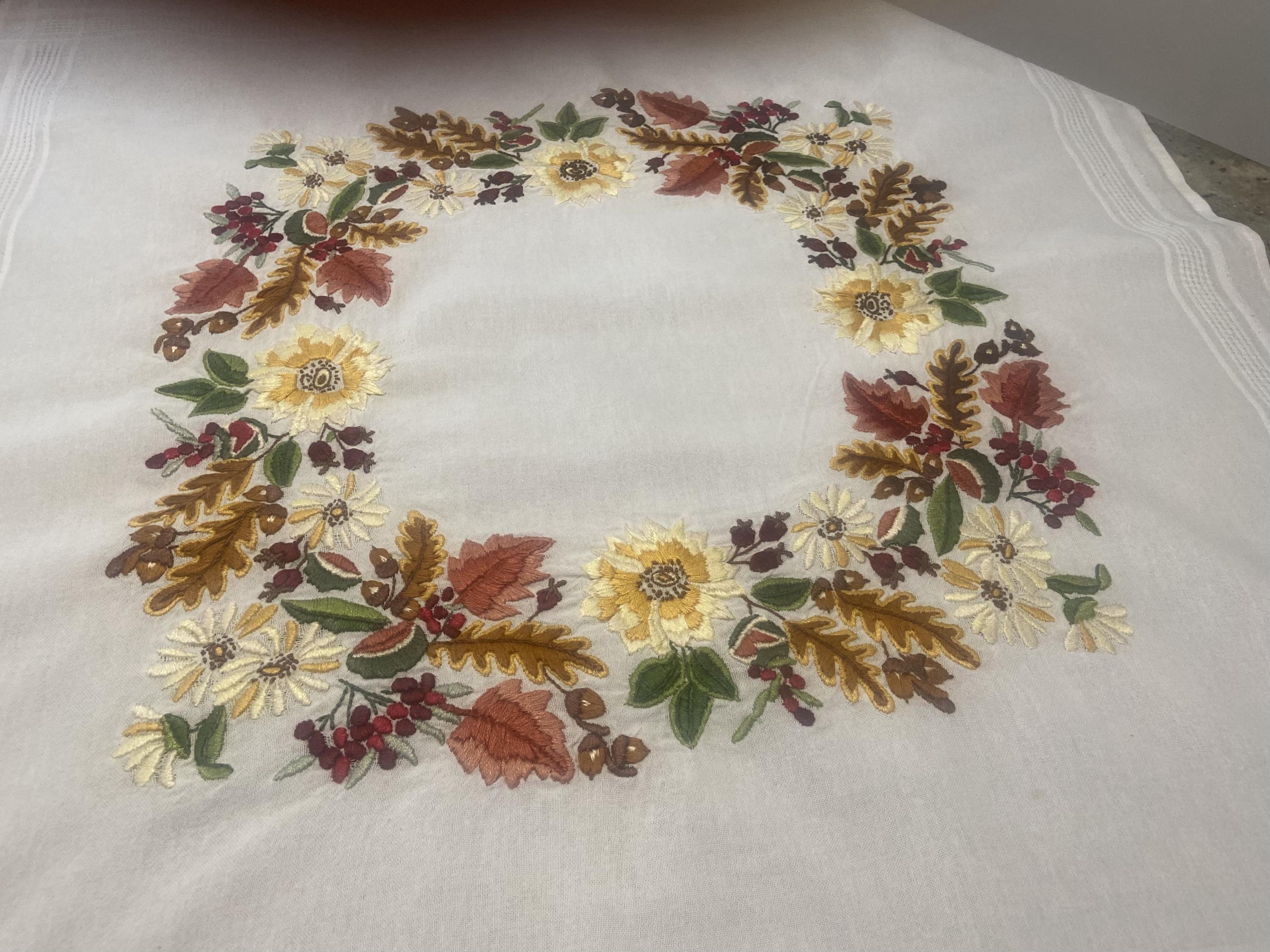 Hand-embroidered tablecloth on a white cotton background, 80x80 cm, autumn floral design